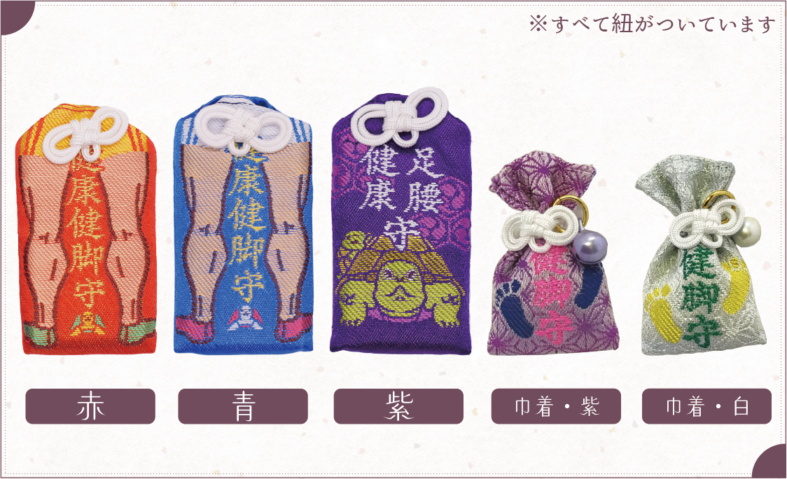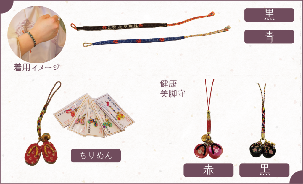 在神社境內供奉著可以足腰健康、健步安康的社北向道祖神。因此神社也設計了幾款與足腰健康有關,甚至是美腳的御守。