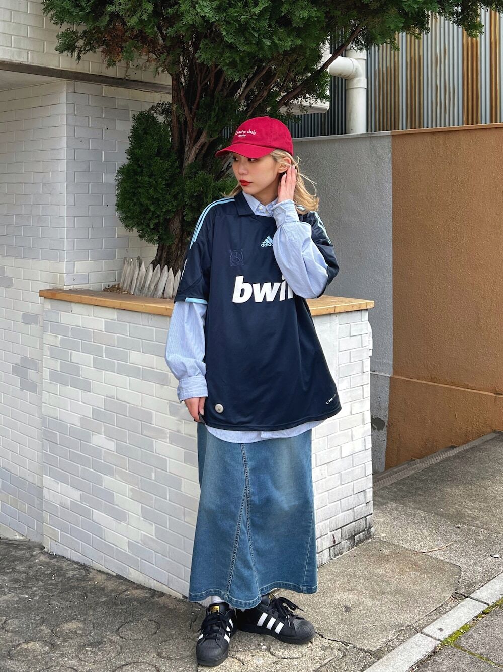 當想為衣著增加幾分搭配玩餵時,不妨嘗試融入運動街頭風單品,像是寬感或翻領條紋上衣都是不錯的推薦,下半身選用開衩牛仔裙,能為穿搭注入幾分街頭印象,結合厚底球鞋和白襪,立即展現專屬魅力的日系街頭 Look 。