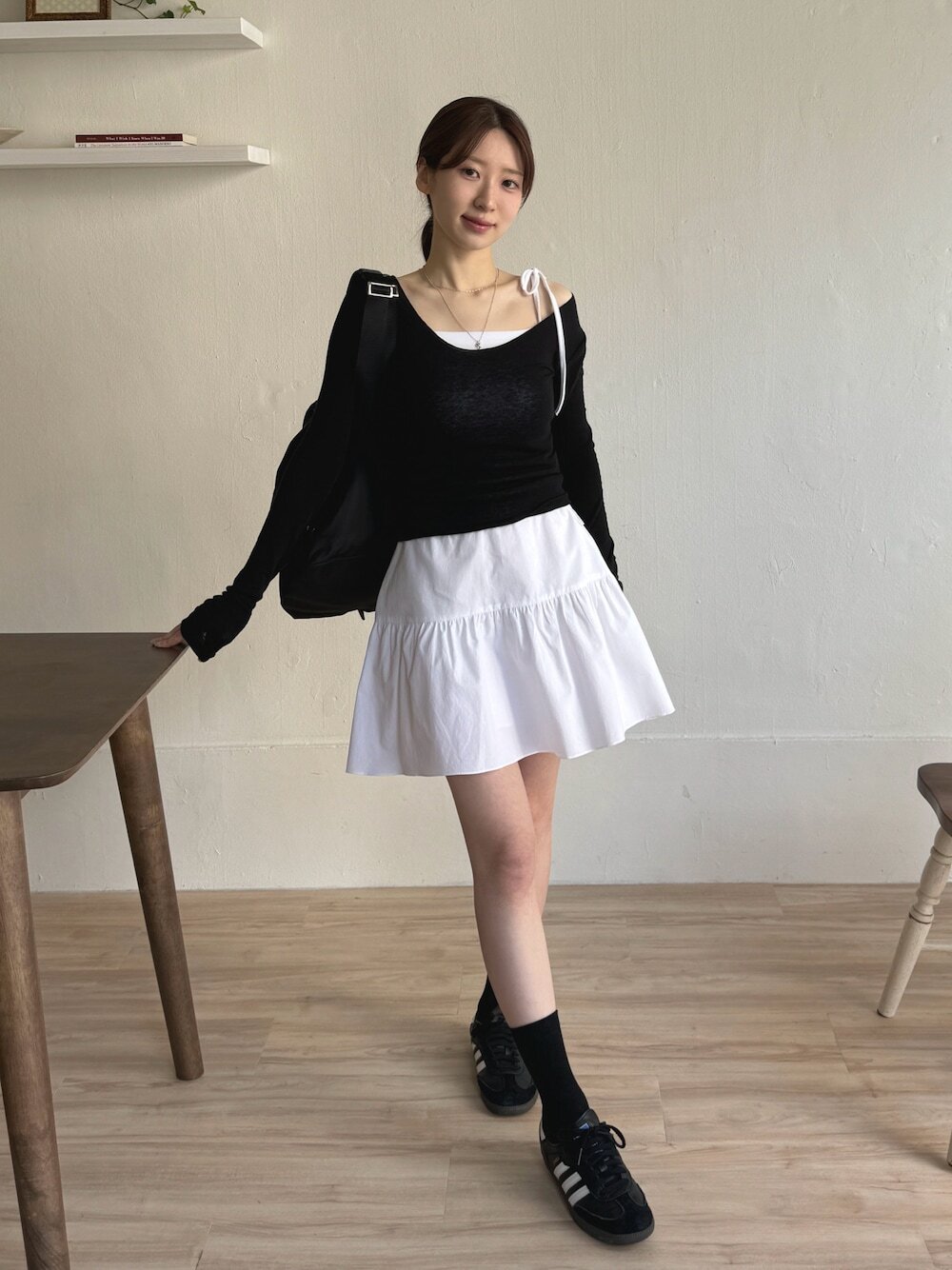 帶點溫柔形象的 A字短裙,向來是能為衣著增添一股優雅魅力的必備單品,斜線剪裁能讓臀部有收縮感,同時使大腿擁有小一吋的視覺,以寬領口或 oversize 上衣混合,營造令人注目的日系慵懶風,另外加上長襪與球鞋,簡單傳達好感度滿分的迷人造型。