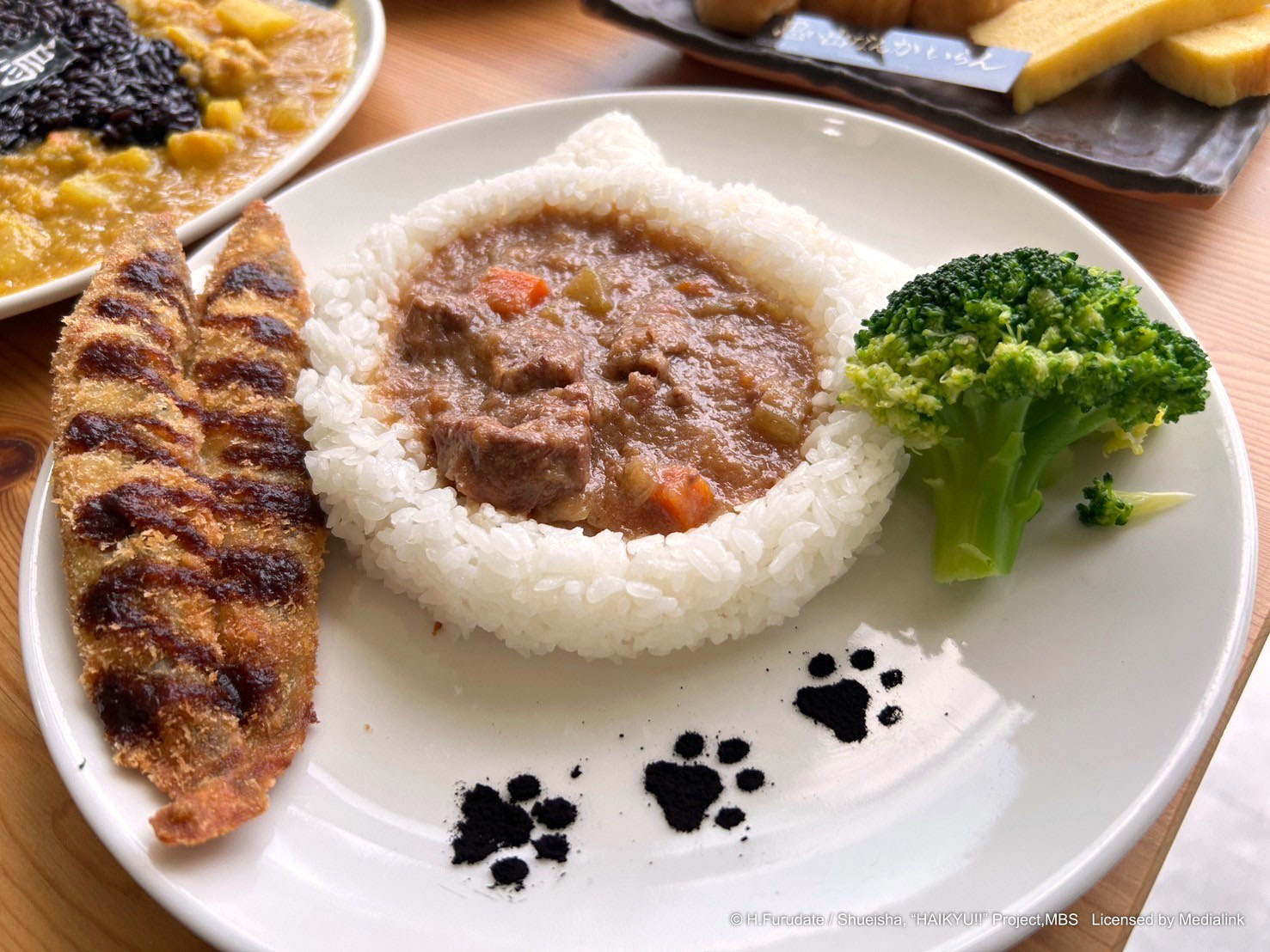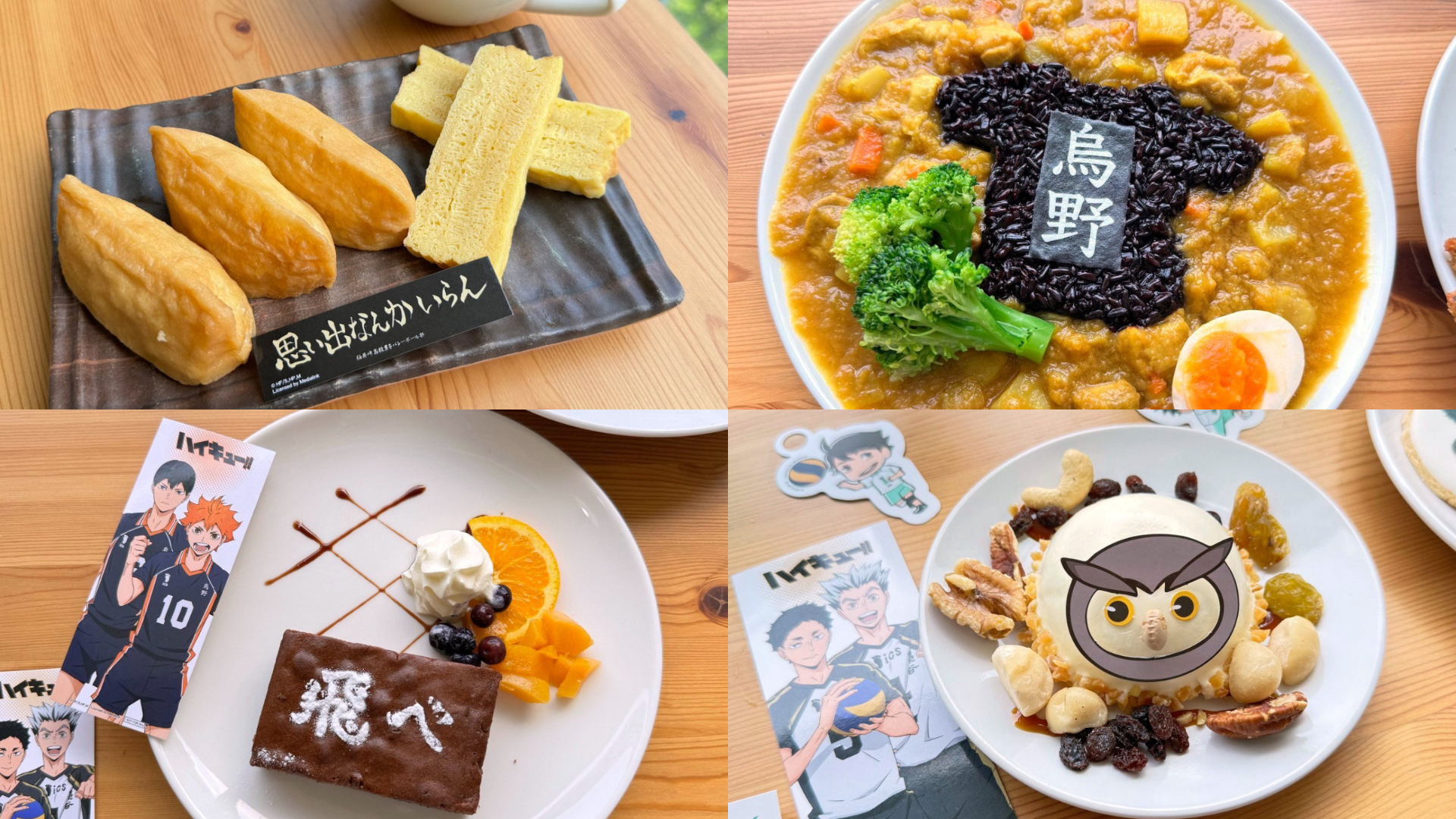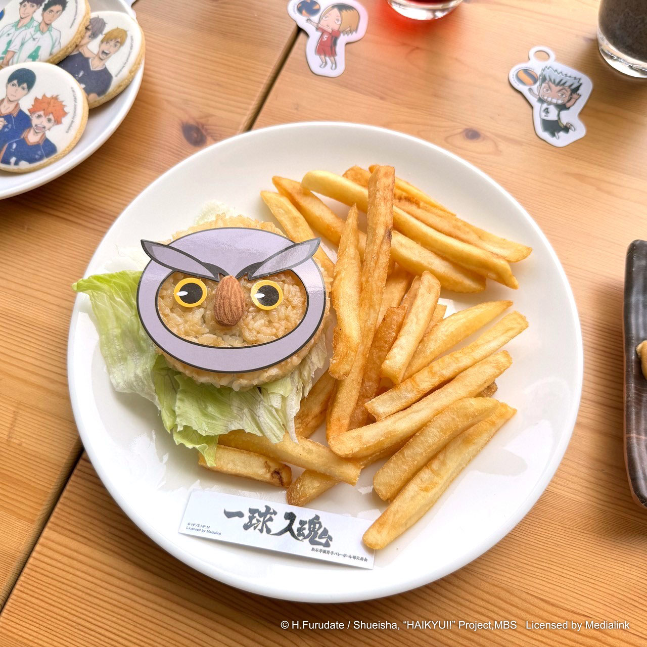 這次餐點以各校為概念,一共推出五道主餐、五道甜點及十款飲品。主餐的部分以學校的特色設計,像是「烏野高中」的炸雞咖哩飯,超可愛的烏野球衣配上咖哩醬汁;「稻荷崎高中」稻荷壽司定食,是以狐狸吉祥物為發想的豆皮壽司定食;「梟谷學園高中」以超可愛的貓頭鷹造型做成米漢堡套餐,讓人捨不得吃下去!