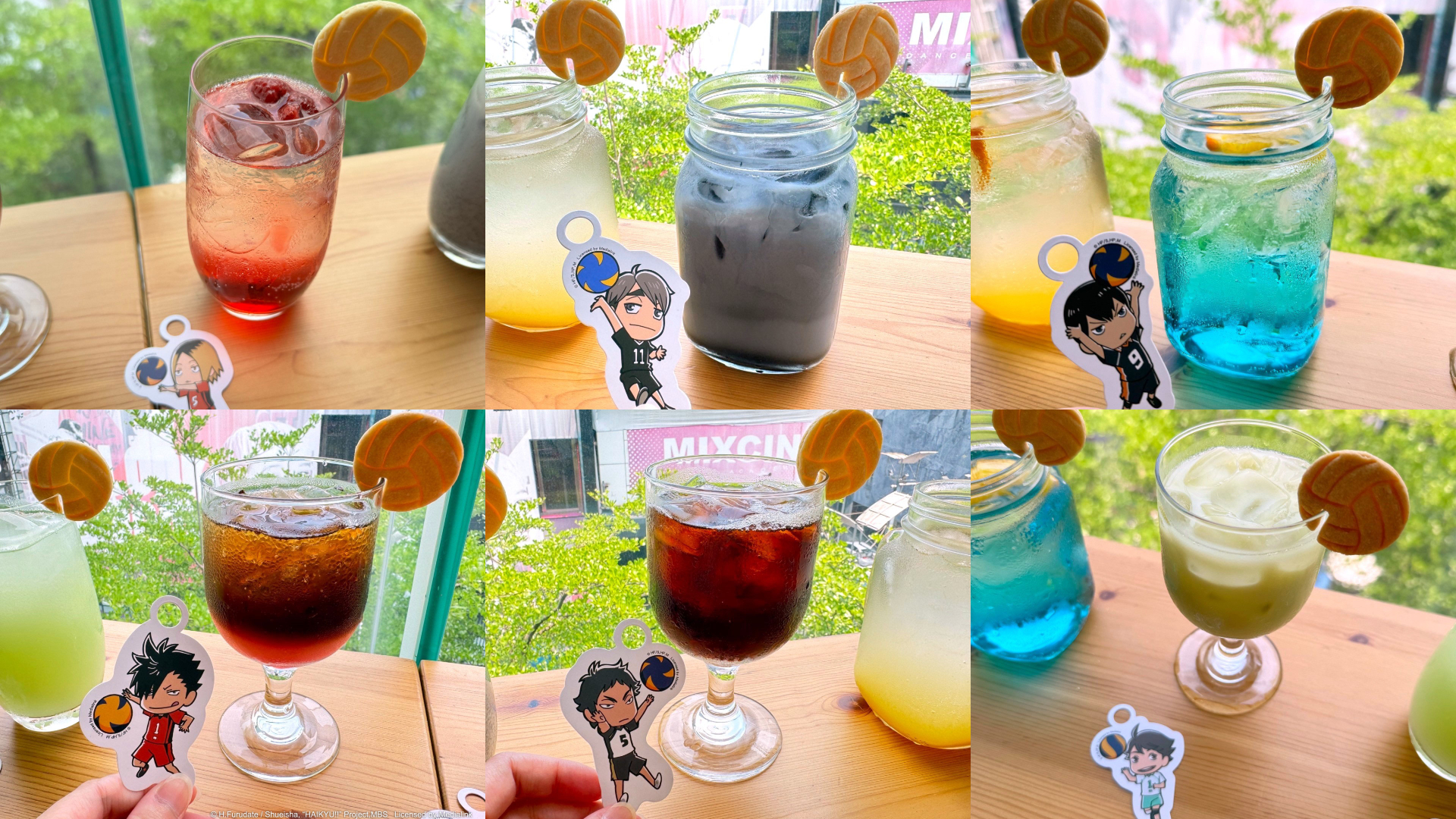 飲料則以角色的形象代表色進行發想,而且更在飲料杯緣加上了排球造型的小餅乾,細節滿滿;「日向翔陽」柳橙氣泡飲、「影山飛雄」藍柑橘氣泡飲、「黑尾鐵朗」葡萄柚咖啡、「孤爪研磨」蔓越莓氣泡飲、「木兔光太郎」芝麻牛奶、「赤葦京治」黑咖啡、「宮侑」芒果可爾必思氣泡飲、「宮治」竹炭牛奶、「及川徹」泰式綠奶茶、「岩泉一」奇異果可爾必思。每款飲料都充滿特色,身為排球鐵粉,一定要通通喝過一輪的呀!