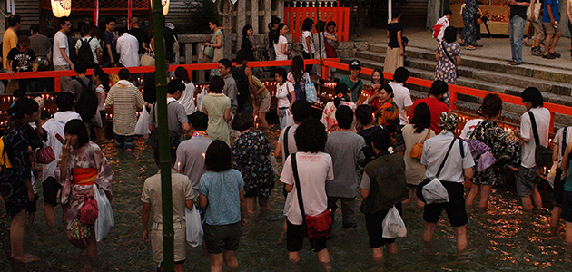 在平安時代時,貴族們會在季節交替時以香薰草藥沐浴,用來去除罪惡和汙穢。於是在每年的土用丑日*,神社境內的御手洗池中都會舉行「浸足神事(足つけ神事)」。 男女老少齊聚一堂,在御手洗池中將膝蓋以下部分浸入水中,祈求無病無災。