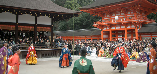 現代足球運動的原型—蹴鞠,大約在1400年前與佛教等一起從中國傳入日本。之後,雖然在中國和東南亞逐漸衰落,但在日本成為從天皇到民眾,男女老少都會參與的活動。每年1月4日下鴨神社都會舉辦舉行踢蹴鞠的慶典。身穿傳統服飾的鞠人們4人、6人或8人一組圍成圓圈,用鞋背踢起鞠,展示精湛的腳法。 踢鞠時清脆的聲音和鞠人的叫聲,讓觀眾彷彿置身於一個超越時空的奇妙世界。
