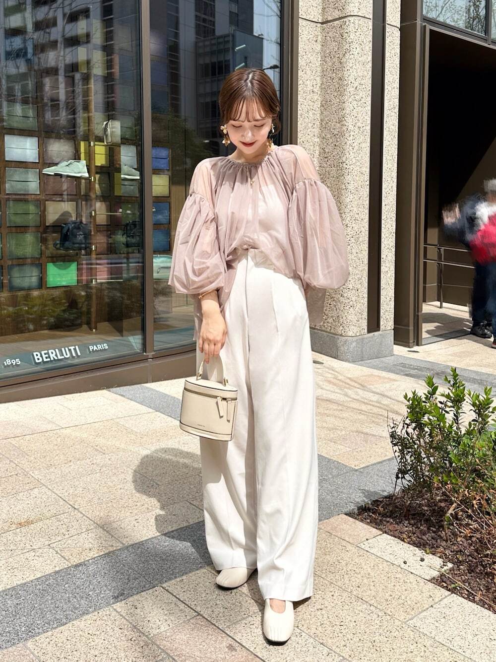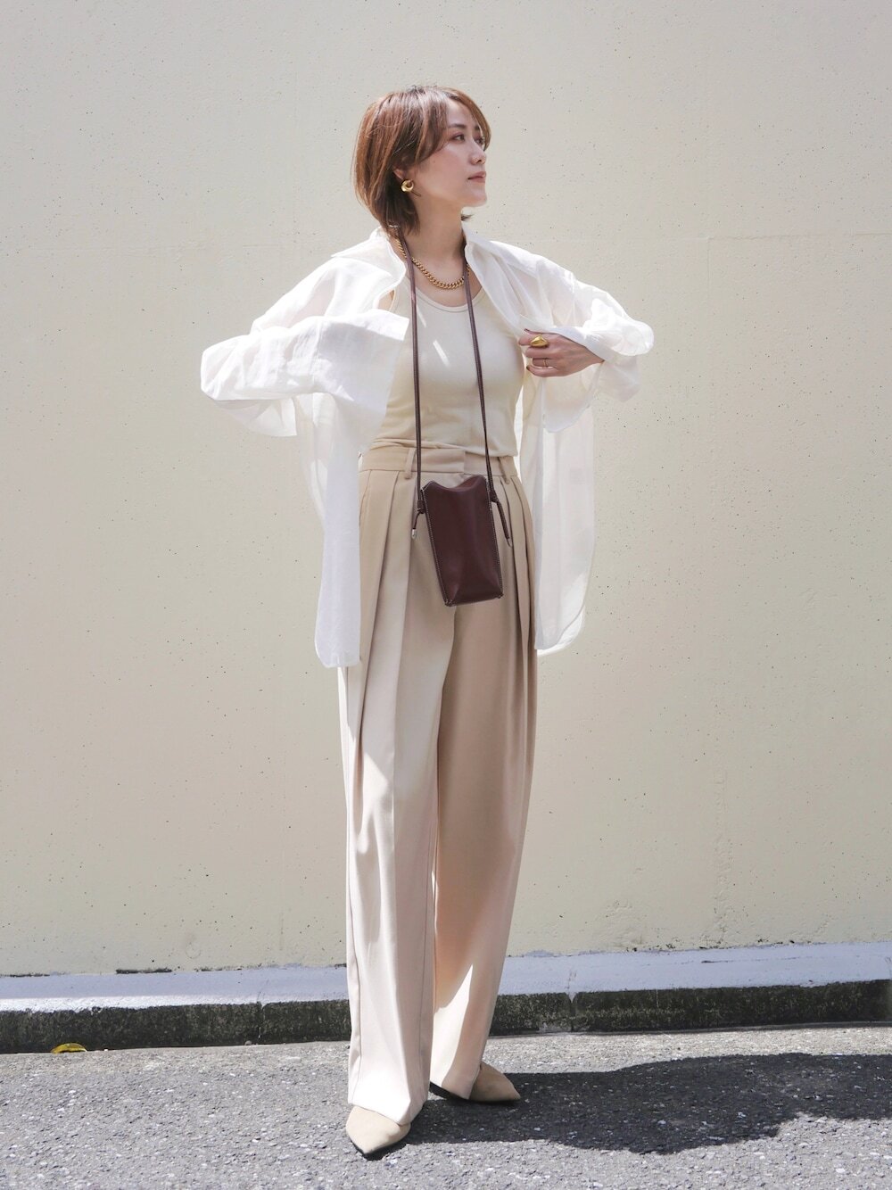 輕盈的白色系單品,屬於百搭好駕馭色系,向來適合在夏日裡著用,不僅能使穿搭視覺提升輕透涼爽的感受,結合透膚襯衫混搭白色長褲,營造簡約乾淨的季節風格,注重舒適感的搭配方式,即使在戶外一整天也不會感覺炎熱,隨性踏上平底鞋或涼鞋就很好看加分。