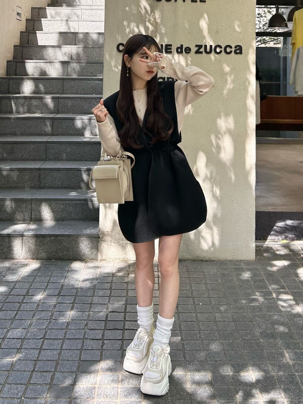 平時給人較為正式感的中長版背心外套,當想分散既定印象的話,推薦將中長版背心當作短洋裝穿著,立即為衣著增添幾分輕甜可愛氛圍,內搭背心或透膚上加乘,使造型擁有滿分焦點,另外混搭肩背包、手拿包,再踏上厚底鞋款就很好看加分