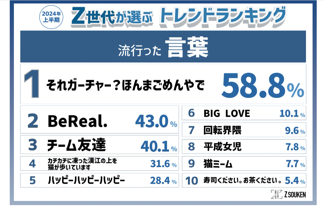 還記得之前「蛙化現象」這個詞嗎?意指心儀對象做出讓自己反感的事情,頓時好感全失,這是去年日本的流行語之一,這些流行語都是由「Z總研」票選出來的。Z總研是由N.D.Promotion株式會社經營的Nom de plume(ノンデプルーム)的讀者組成,主要由對潮流敏感的Z世代女生組成的Z總研獨有的真實Z世代社區成員進行趨勢調查,最近發布了《Z總研2024年上半年趨勢排行榜》。
