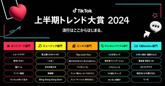 TikTok每年都會選出平台上最受使用者歡迎、最流行的人事物。第四度發表的「TikTok上半年流行大賞2024」,總共選出25個候選名單,包括各種流行關鍵字、歌曲、美食、電影、日劇、動畫、美妝與人氣創作者等等,並將在6月20日以直播的方式發表最終勝出的名單。趕快來看看2024年上半年網路上最流行什麼吧!