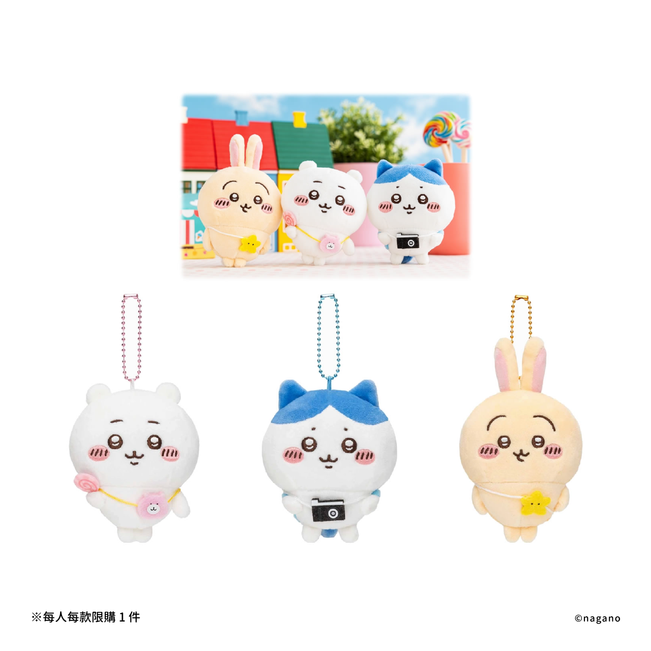 俗稱出遊系列的玩偶是這次商品中非常有人氣的一款。吉伊卡哇背著可愛的粉色小包,手拿糖果的樣子超級可愛;小八貓則是背著他寶貝的相機;兔子則是背著星星造型的包包,看起來都非常期待出去玩的樣子!
