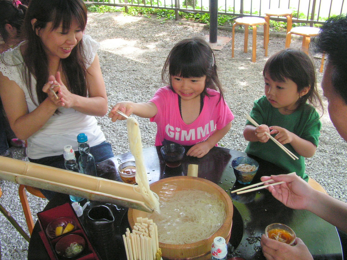 流水麵,原文為「流しそうめん」,是一種利用竹管流水來享用麵條的獨特吃法。這種習俗起源於日本的山區,特別是京都和奈良地區。竹管內流淌著冰涼的清水,細長的素麵順著水流滑下,饕客們需要用筷子迅速夾起麵條,沾上特製的醬汁食用。這樣的體驗既充滿樂趣,又能在炎熱的夏日中帶來一絲清涼。