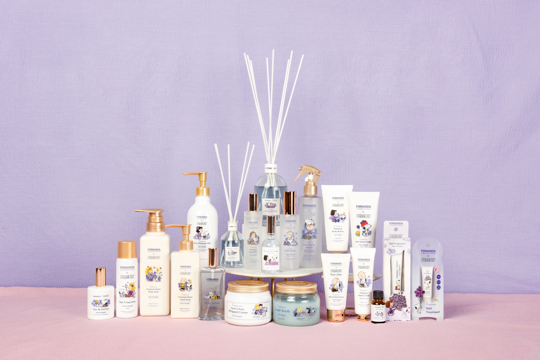 本系列的包裝以「Maria Regale」代表性的紫色花卉為基調,將這款香氛的溫柔和高雅,以及全世界喜愛的史努比與朋友們所營造的可愛氛圍巧妙地結合,表現得可愛動人。