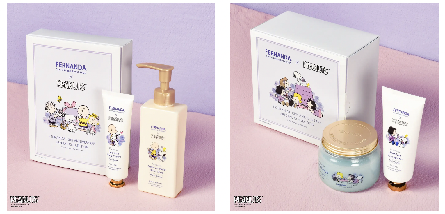 日本人氣評價香氛品牌FERNANDA為了紀念品牌成立15週年,於6月21日(五)推出以品牌經典香氛「Maria Regale」為基礎的史奴比特別版紀念包裝,全系列總共有23款商品,以下就為大家介紹這次聯名商品。