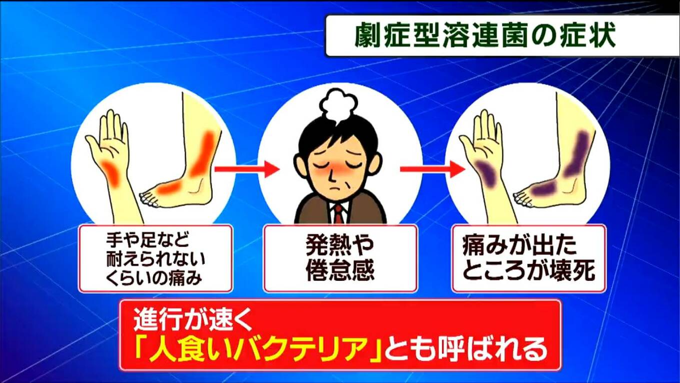 目前已知食人菌「A 型鏈球菌(日稱:劇症型溶連菌)」在初期的感染症狀為四肢的紅腫、疼痛以及發燒,並且也有可能會併發血壓降低等狀況。而在引起血壓低下等症狀後,嚴重情況則會進而導致各個器官衰竭、並且在症狀發生的數十個小時之內就致命。