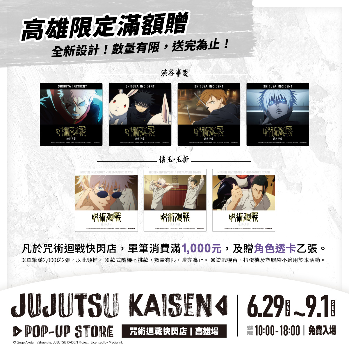 另外,高雄場一樣有僅此一家別無分號的滿額贈!單筆消費滿1,000元,即贈限量全新設計的角色透卡!而結帳金額每超過500元,更可用50元加購雷射徽章Q版款!如此不講武德的大放送是否讓你起了不能錯過高雄場的心呢?炎炎夏日,來高雄吃個冰、逛個咒術迴戰快閃店吧!