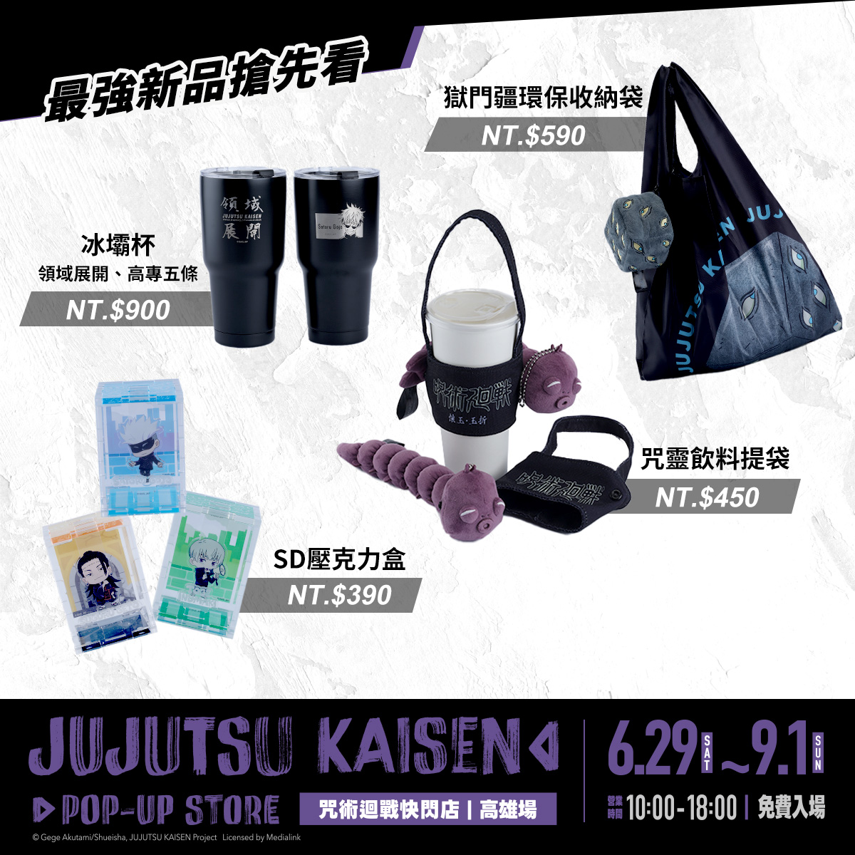 當然,除了再度回味咒術迴戰第二季的種種之外,最終站高雄場更全新企劃數十款新品,如消息一出就引發熱列討論的「獄門疆環保收納袋」(NT.$590)、「冰霸杯」(NT.$900)與伏黑慎爾的「咒靈飲料提袋」(NT.$450)。