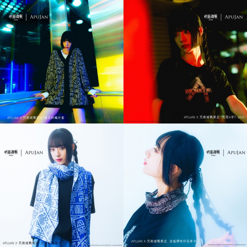 以多樣化針織技藝、原創布料搭配古代服飾元素為主要作品特色的「APUJAN」,推出霸氣十足符咒系列:「咒符緹花針織外套」(NT.$6,000)、「咒符A字T-shirt」(NT.1,680)、「彈性印花頭巾」(NT.790)與「咒符針織圍巾」(NT.2,980)。