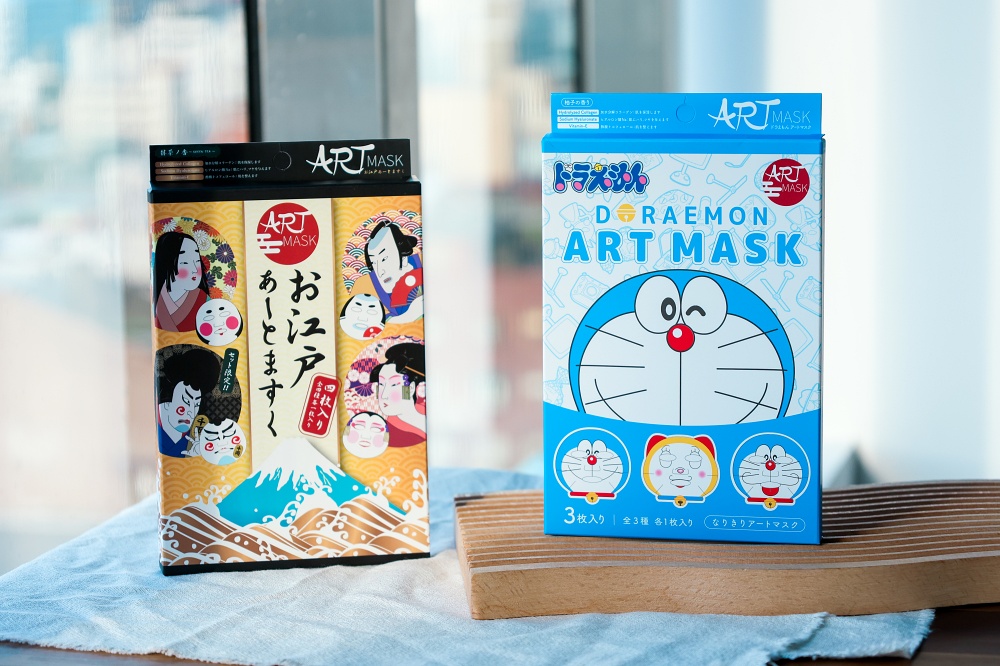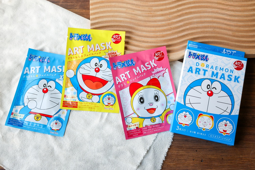 除了充滿傳統日式風情的江戶面膜面,也有採用以知名的日本人氣漫畫角色哆啦 A 夢為主題所設計出的「哆啦 A 夢面膜(アートマスク ドラえもん )」。一盒內共有 3 個造型完全不同的面膜,除了有哆啦 A 夢外,還有可愛的哆啦美喔!