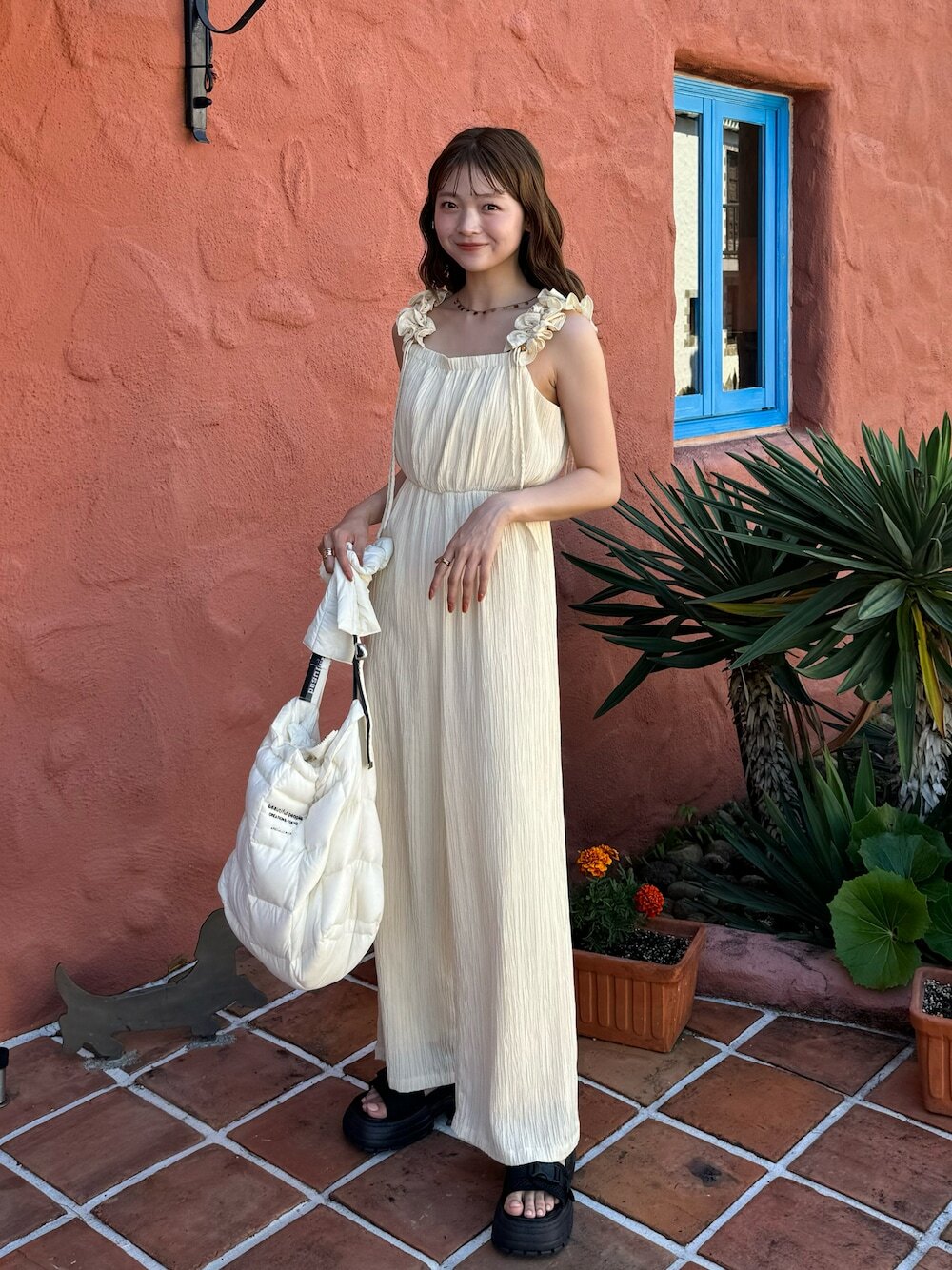 一件式剪裁的連身服,例如長洋裝、連身褲,向來是不需想過多穿搭,即能方便時髦出門的造型神器,融入白色蕾絲與荷葉邊點綴,使細節呈現出滿分質感的仙氣,隨性揹個肩背包再踏上涼鞋,瞬間打造注目的夏日 LOOK 。