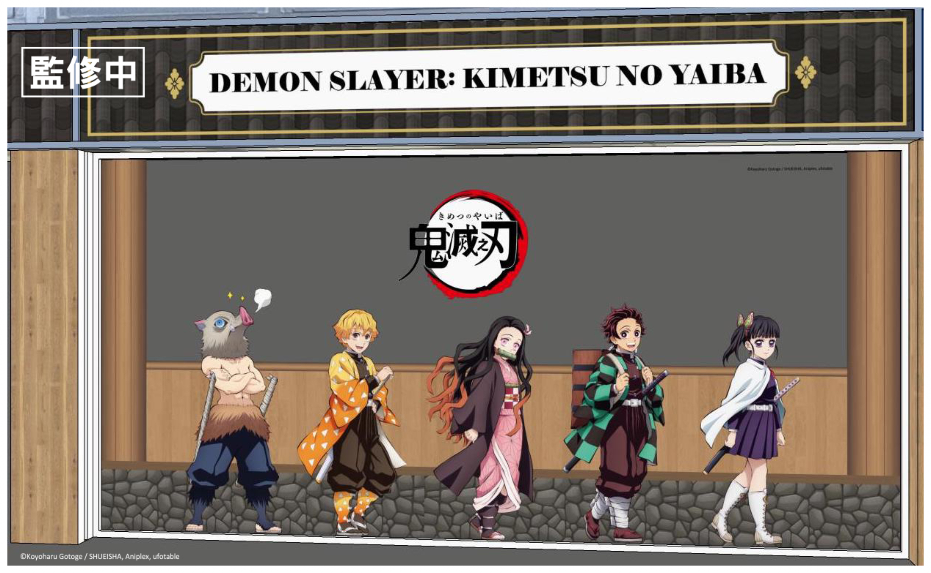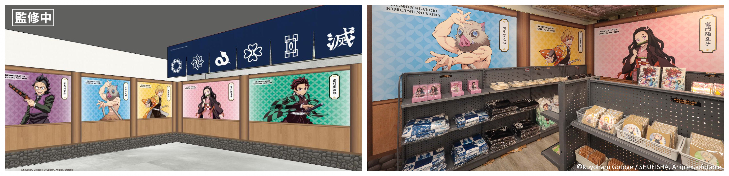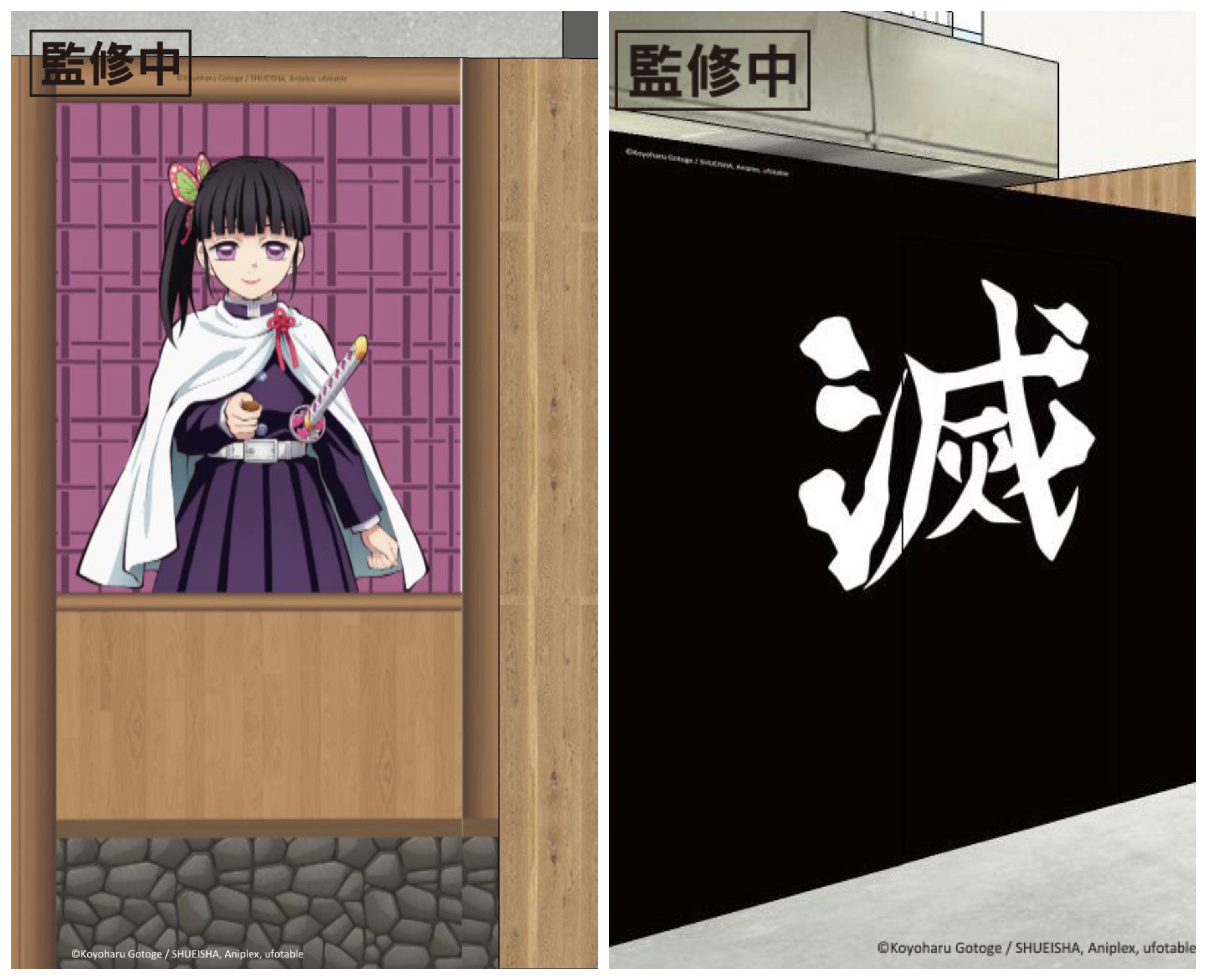 走近店內馬上看到最強鬼殺隊成員「九柱集合」,每個人都擺出超帥動作等你拍,轉個彎來到門口「鬼殺隊成員&禰豆子」炭治郎、禰豆子、善逸、伊之助及香奈乎都在門口歡迎大家,接著看到握著日輪刀的霞柱無一郎、揮舞日輪刀的戀柱蜜璃配上惡鬼滅殺四個大字的「刀匠村大扭蛋」,你還敢不扭嗎?