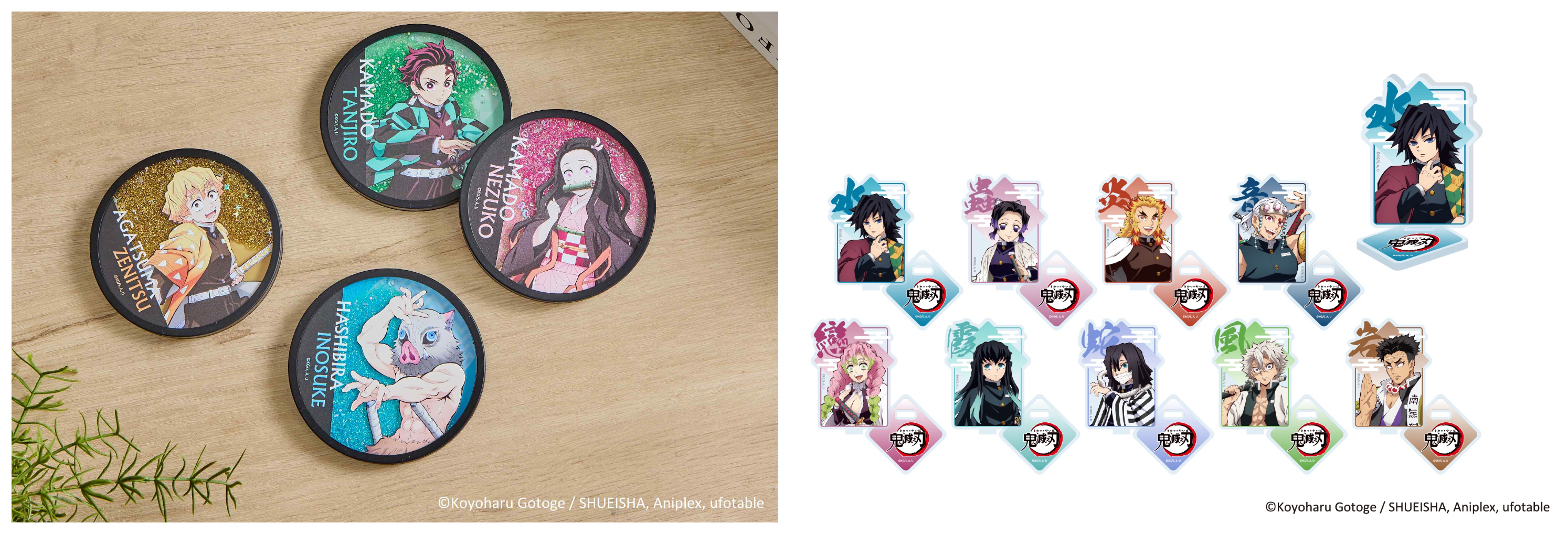 盲抽「小立牌」九人九色,不要放棄,努力抽到你最愛的角色吧!「鑰匙圈」除了炭治郎、禰豆子、善逸、伊之助四大主角外,還有義勇、忍、杏壽郎、天元、蜜璃及無一郎六位柱的款式,讓你的鑰匙串及背包充滿鬼殺隊,以黑色為主色搭配四大主角色形象色的「流沙杯墊」又帥又實用!