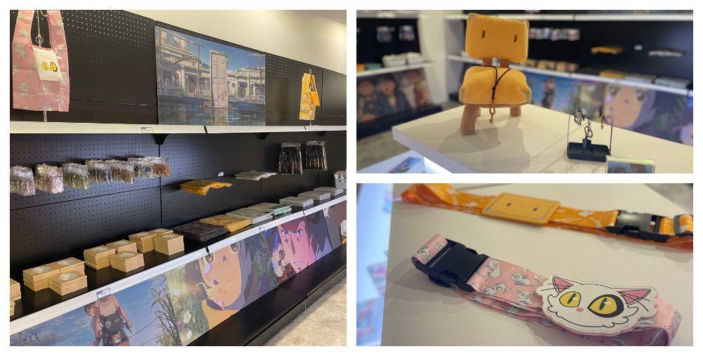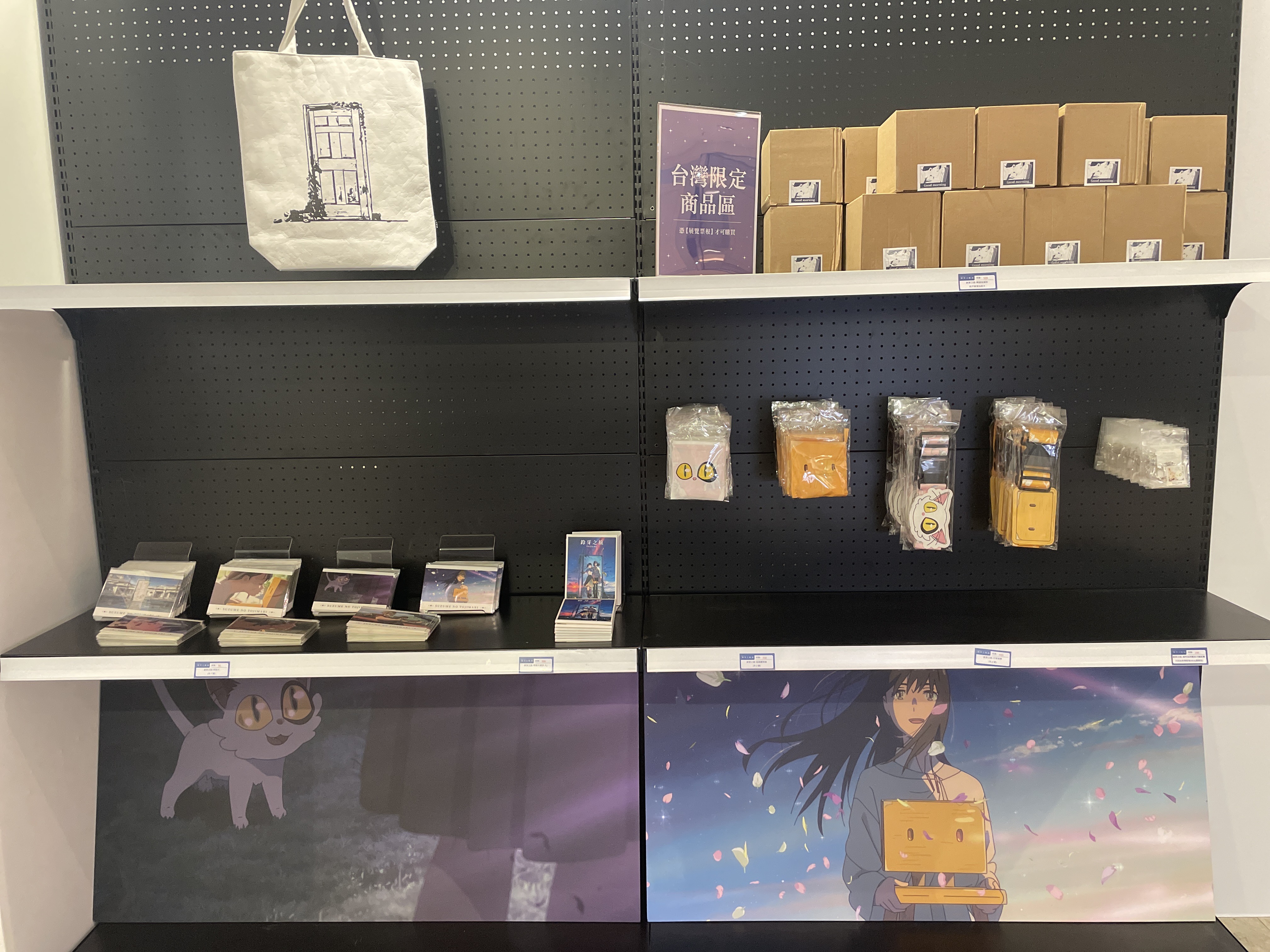 除了豐富的展區外,本次「鈴芽之旅」台北展,還為粉絲們準備了日本原裝空運來台的限量周邊、限定拍貼機、紀念卡片列印機,除此之外,還將推出一系列全新日本監修的《鈴芽之旅》台北展獨家限定商品!有精美的特製海報、門簾、以鈴芽、草太和大臣為原型設計的超可愛周邊,包括吊飾、購物袋和緹花襪子等商品,令人愛不釋手。