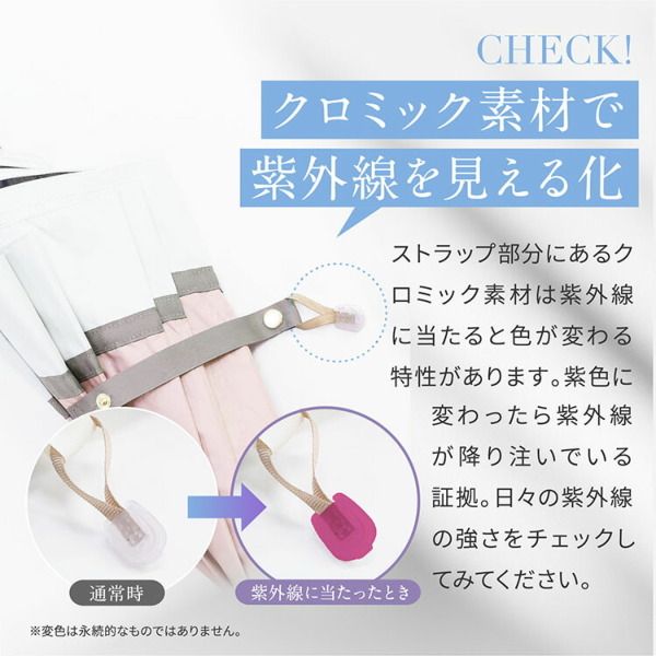 不僅是有完全遮光的高性能,此遮陽傘還採用了抗風結構的骨架,能有效抵擋強風,加上簡約高雅的純色拼接設計,共有8色可供選擇,綁帶上甚至還附上可以偵測紫外線的小工具,不僅實用且美觀,也受到廣大消費者的喜愛。