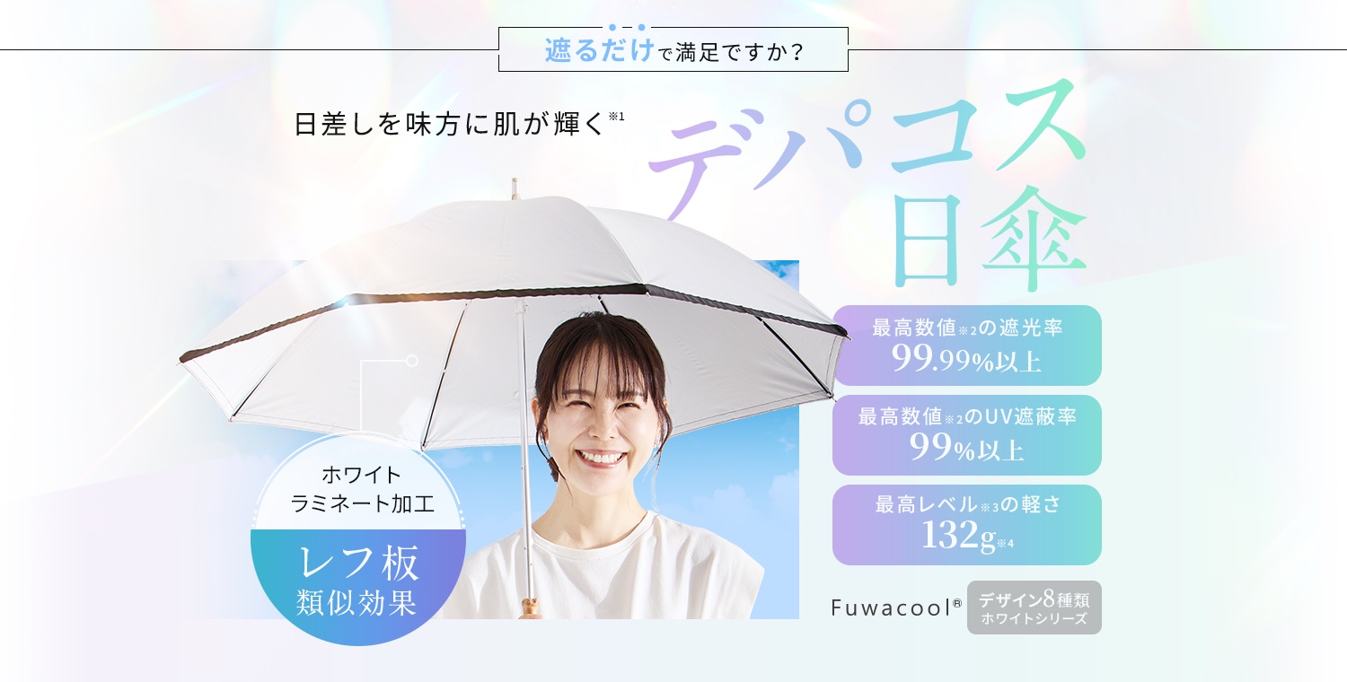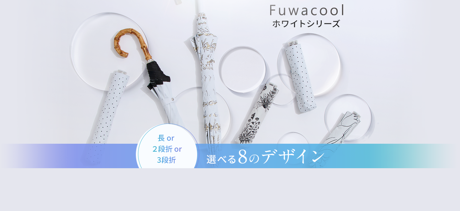 Fuwacool有長傘、二折傘和三折傘三種款式,傘面還可以根據喜好選擇素面或是花紋。傘內裡除了「讓膚色明亮的柔和粉金色(白色系列)」外,還有「堅固防護的青銅金色(黑色系列)」可供選擇,都能有效吸收反射的紫外線,為肌膚提供全面的防護。