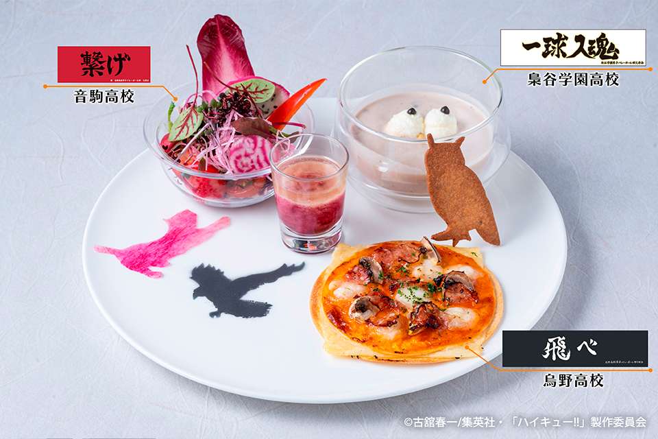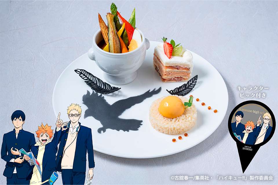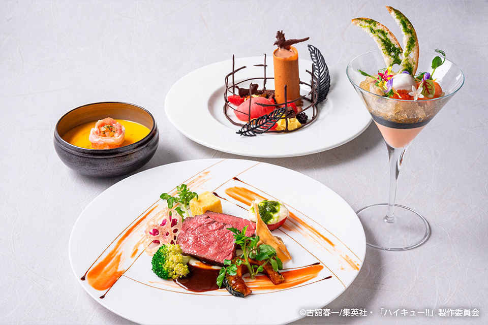 位於飯店25樓,可以俯瞰澀谷街頭的高級法式餐廳「À bientôt( ア ビエント)」也推出了《排球少年!!》主題套餐「À bientôt course –HAIKYU!!-」,包含前菜、湯品、主餐到甜點共四道法式料理,其中甜點更以電影版「垃圾場的決戰」為主題,以薄可麗餅皮、內餡是巧克力慕斯和覆盆子醬。用巧克力製作出破碎的鳥籠,設計出對峙的烏鴉與貓咪,利用鮮明的色彩搭配,重現電影版的精彩畫面。