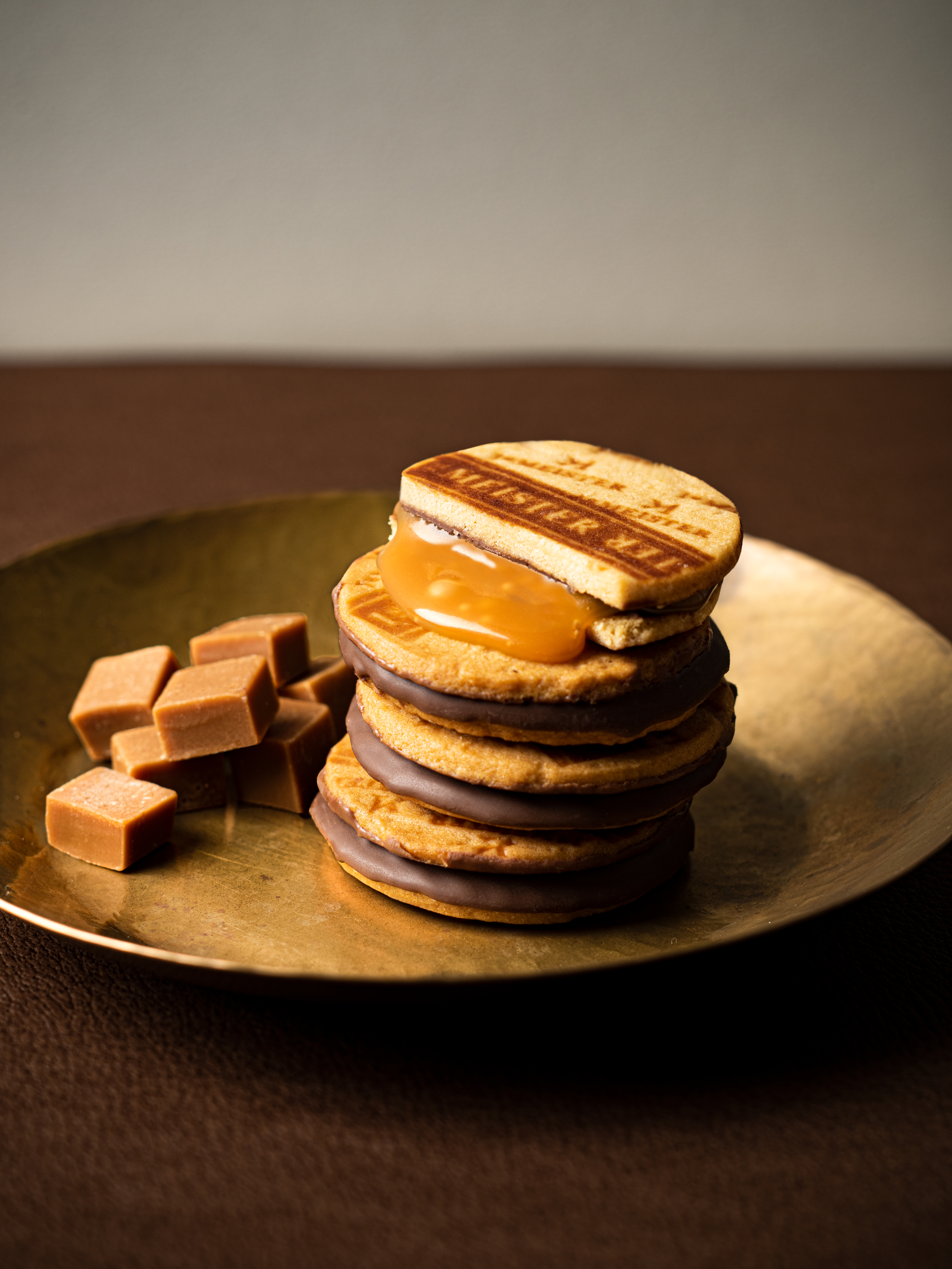 一口咬下,先是餅乾、巧克力、焦糖在口中各有滋味,化開融合後又滿是絕妙的味蕾享受。堅持嚴選由日本自然環境孕育出的美味食材,如北海道奶油、稀有的十勝鮮奶油和沖繩黑糖。堅持對製法的精益求精,使用講究的製法熬煮而成的「特製焦糖」,夾入能昇華焦糖口感的特製奶油餅乾中,只願每一塊餅乾都能為顧客帶來更多的幸福享受。
