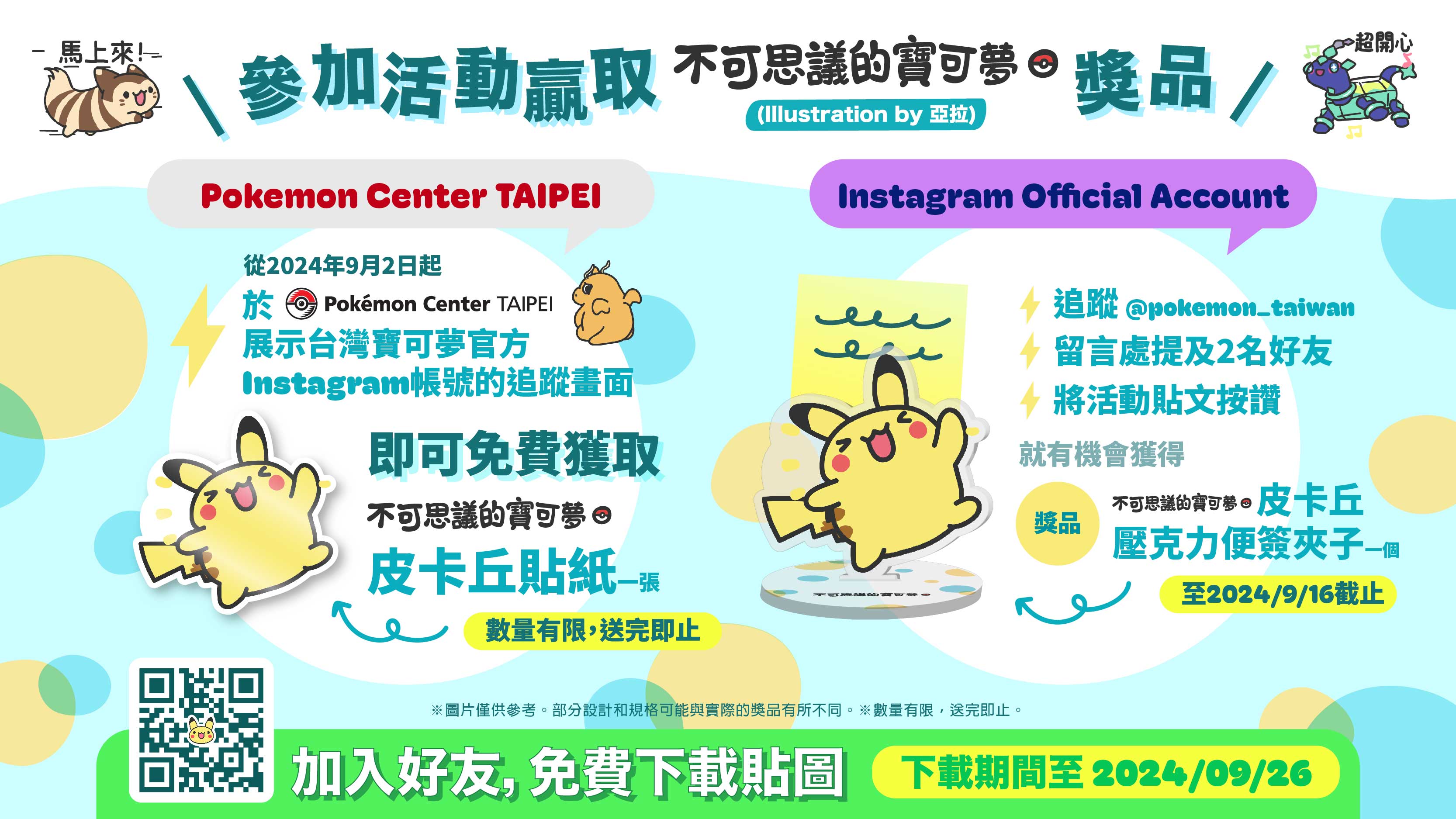 2024年9月2日至2024年9月26日為止,在Pokémon Center TAIPEI向員工出示台灣官方Instagram帳號的追蹤畫面,即可獲得「不可思議的寶可夢」貼圖中皮卡丘的貼紙!店內的還設有寶可夢們的裝飾及拍照區等「不可思議的寶可夢」拍照點。