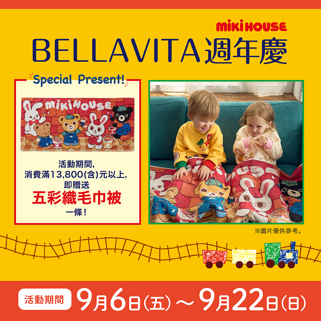 想要認識更多MIKI HOUSE也可以閱讀之前編輯部介紹過的品牌文章,或者直接到MIKI HOUSE官網,深度認識這個身為熱愛日系購物的家長必知的日本童裝品牌!除此之外近期9月6日起至9月22日,配合BELLAVITA週年慶,MIKI HOUSE為家中寶貝準備了精緻的滿額贈禮「五彩織毛巾被」,使用日本產頂級今治毛巾絲線製成,並使用五彩織的技術展現出柔軟觸感以及鮮豔色彩,呵護陪伴寶貝的床上時光,數量有限,手刀要快唷!