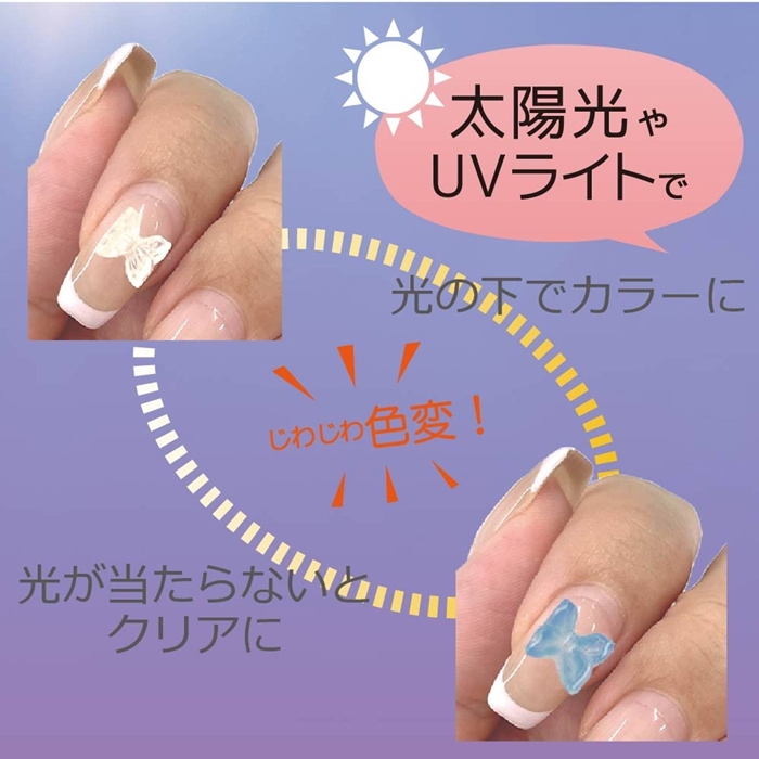 日本大創有許多不同的美甲貼紙,無論是圖案或顏色都非常多元,而最近這款半透明美甲貼更是超特別,遇到太陽UV光就會自動變色,顏色部分有紫、橘、藍、粉紅,以及三種不同的造型圖案,絕對夠用!