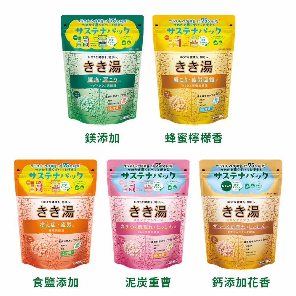 添加鹼性溫泉礦物成分,溫浴效果能讓人放鬆且舒緩疲勞。柔和清甜香氣,含潤澤成分,能使泡澡後肌膚不乾澀。200公升的水加入20~25克即可。