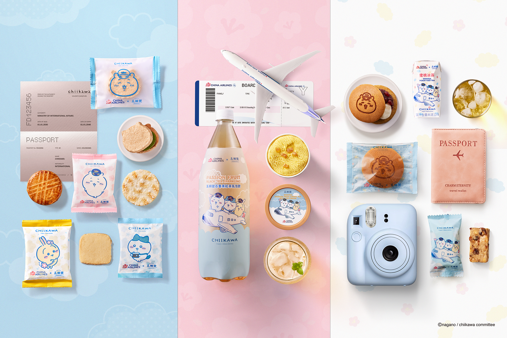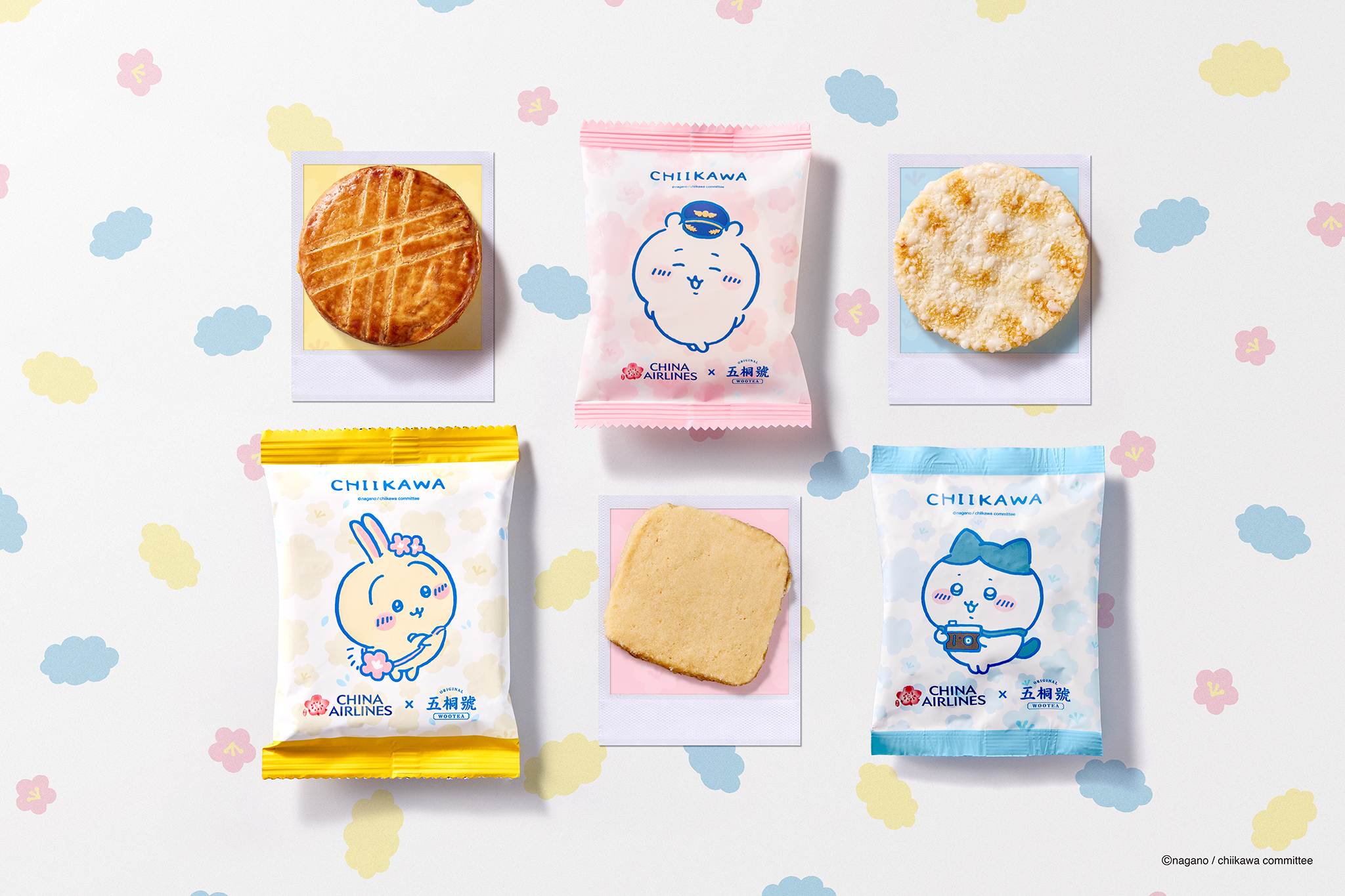 內向可愛的吉伊卡哇、個性開朗樂觀的小八貓,還有充滿活力的兔兔一同躍上華航機上甜品包裝;自桃園出發的日本航線經濟艙旅客可以品嘗到日式風味的抹茶達克瓦茲,長程航線豪華經濟艙是鹽之花布列塔尼酥,經濟艙則有抹茶紅豆 Q 心銅鑼燒,從松山、高雄出發的經濟艙旅客,則有機會在高空享用楓糖奶油沙布雷。