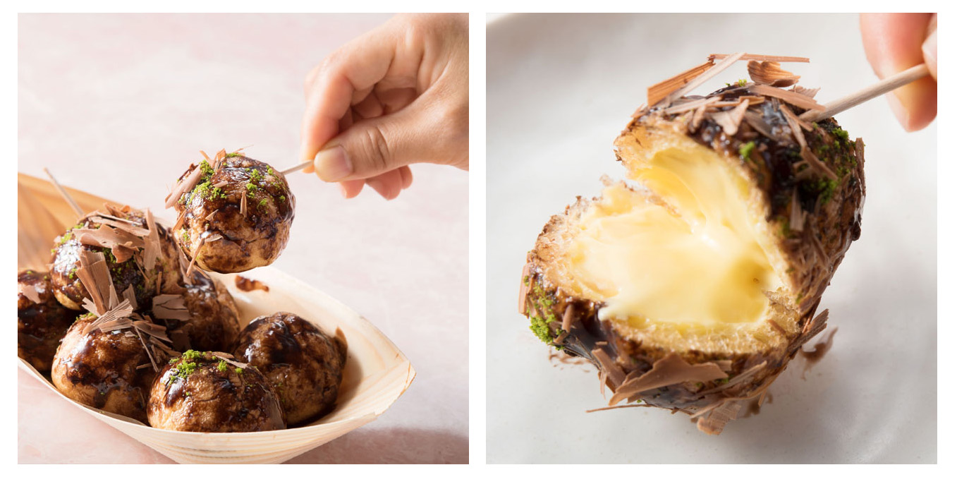 恩?單看外表,這不就是章魚燒嗎?但其實這是仿造章魚燒外型的泡芙!泡芙本身的顏色就有一點接近章魚燒的金黃外皮色,再淋上巧克力醬,簡直像極了淋上醬汁的章魚燒。最後在上面撒上故意弄成一片片的白巧克力碎片,以及抹茶粉,就像是章魚燒上頭撒上的柴魚片和海苔粉一樣,連小細節的還原也不放過。