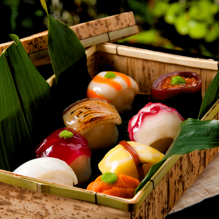 最後一個要介紹的,在造型上也是不得了,是模擬8種壽司外型的和菓子組合,握壽司的醋飯是以蕨餅製成,而每一款握壽司上面的生魚片等食材,都是以和菓子當中常見的種類所製成,像是練切、羊羹等;最上面點綴的芥末,則是以抹茶紅豆餡所製成,個個模仿得如同真的握壽司一般,讓人猜不出這竟是和菓子。