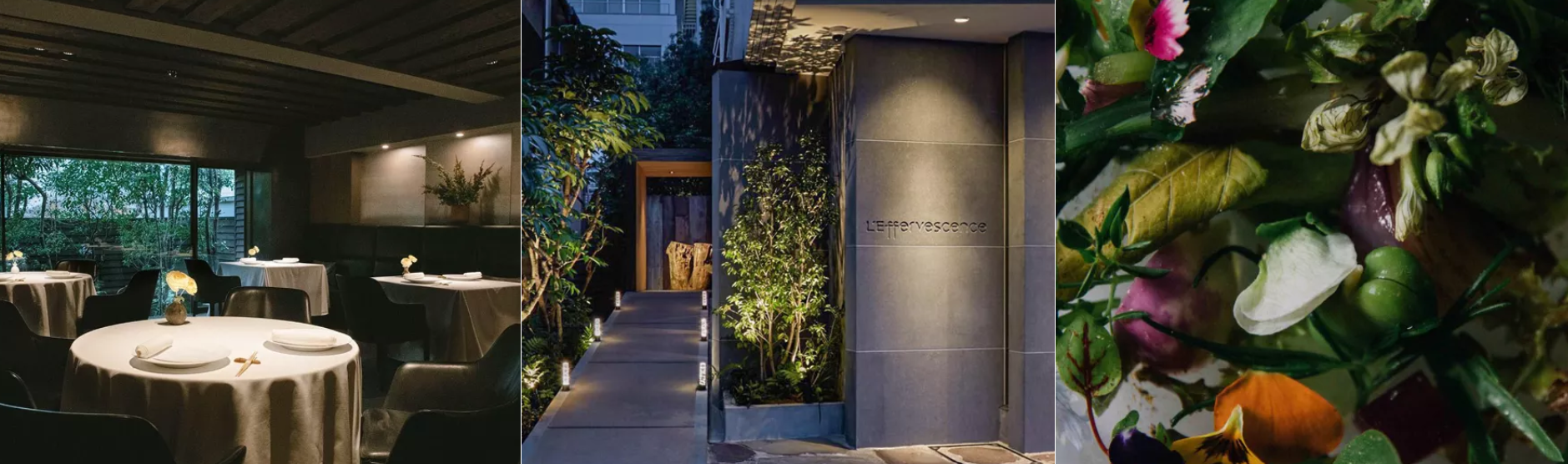 於2010開業的L’Effervescence (レフェルヴェソンス) 在2015年被選為米其林2星餐廳,並於2020年晉級為3星,2025年也持續被選為東京米其林3星餐廳之一。此外,L’Effervescence 入選「亞洲50最佳餐廳」,並因其積極參與全球永續發展目標的實踐及創新設施,受到米其林綠色指南的肯定。