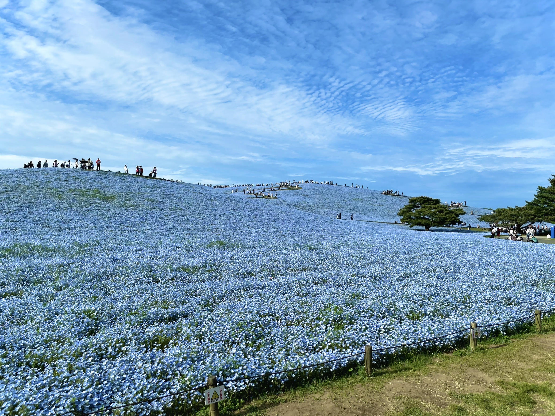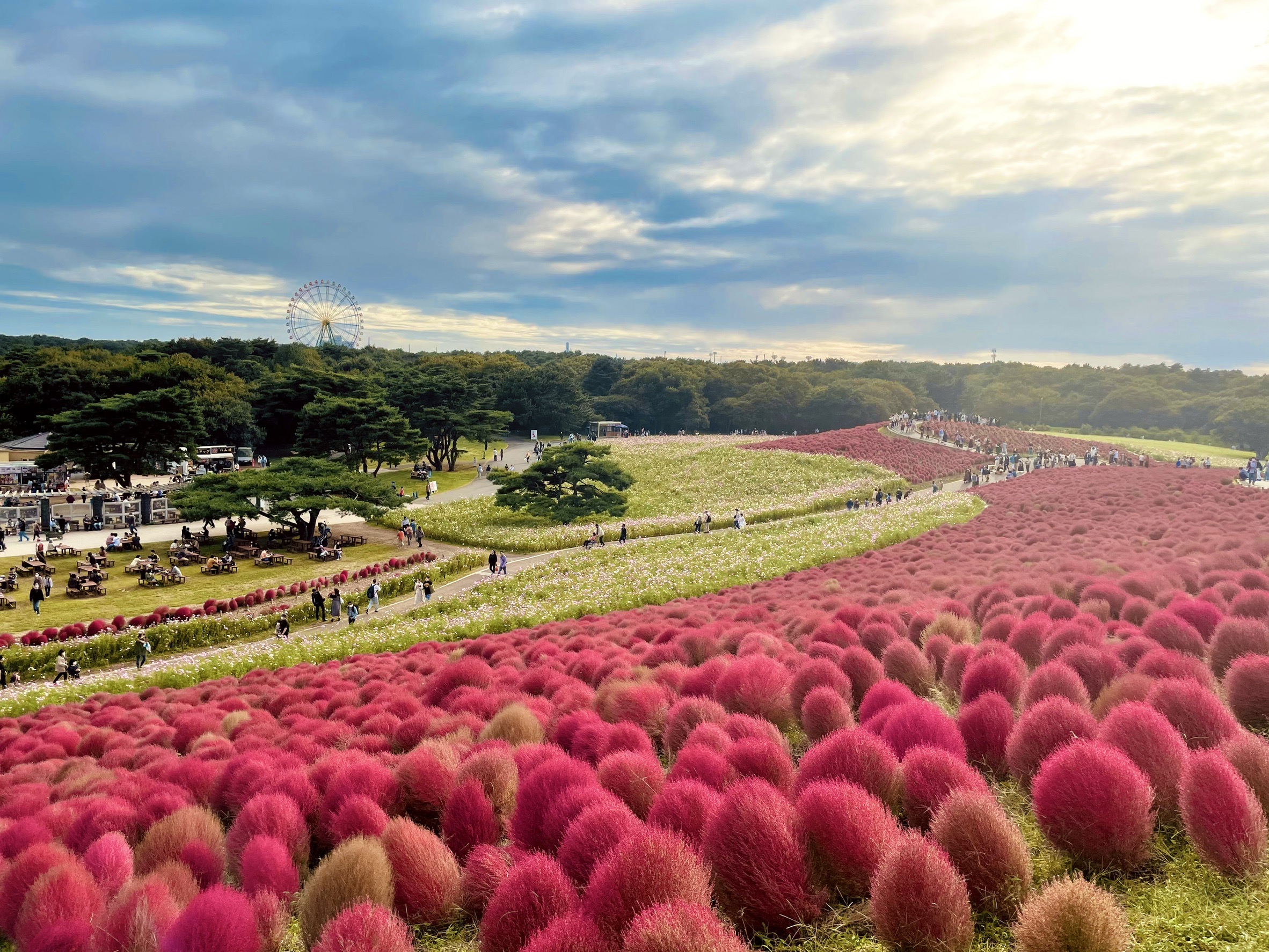 國營常陸海濱公園(国営ひたち海浜公園)是一座占地約350公頃的大型公園。每年4月中旬至5月上旬,見晴之丘(みはらしの丘)上盛開的粉蝶花,猶如藍色地毯,與藍天融為一體,形成壯觀的美景;而9月下旬至10月中旬,波波草從翠綠逐漸轉為鮮紅,為秋日增添迷人的色彩。這兩個花期吸引了大量遊客前來參觀。然而,公園內四季皆有不同的花卉盛開,除了粉蝶花和波波草外,還有水仙、玫瑰、鬱金香等,各式各樣的花卉讓遊客一年四季都能欣賞到不同的自然之美。