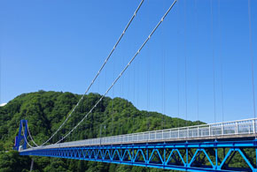 「龍神大吊橋(竜神大吊橋)」是一座橫跨龍神峽的鐵橋,全長375公尺,是日本最大的步行吊橋之一,並被列為茨城百景之一。自1994年開通以來,這座吊橋每年吸引大量遊客,成為當地的重要觀光景點。2001年,吊橋重新粉刷成現今的鮮豔藍色。從吊橋100公尺的高度可以俯瞰壯麗的八溝、阿武隈山脈以及水府城鎮的美景。橋中央設有透明壓克力板,讓遊客能夠直接俯視下方的龍神水壩湖面,這種日常生活中無法體驗的景觀,定能帶來令人屏息的驚險與自然的壯觀。