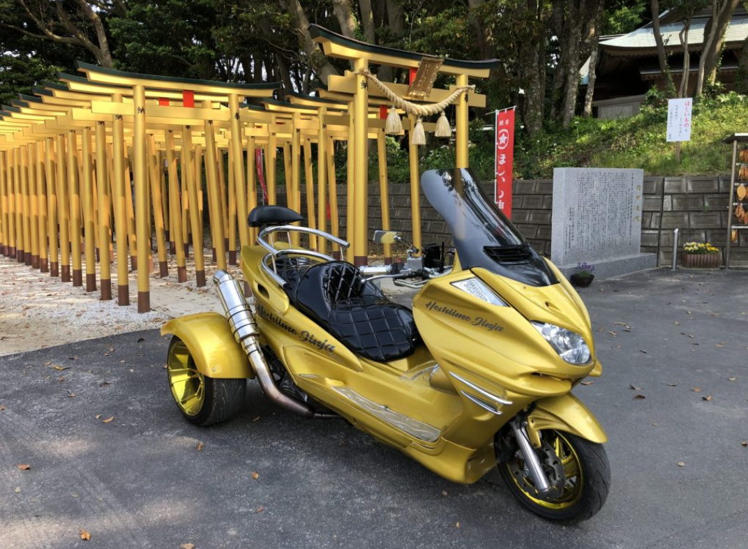 因為地瓜的代表色是金黃色,神社的境內充滿了這一代表色的元素!其中最引人注目的是金黃色的鳥居,它象徵著豐收與繁榮,與神社主題緊密相連,吸引了無數遊客前來參拜和拍照打卡,使地瓜乾神社在短短幾年內成為茨城的熱門景點之一。此外,神社的宮司宮本先生認為「在金色鳥居之後,還需要一個能吸引拍照的打卡點!」於是,他將自己心愛的機車染成了金色,這台金色機車也成為了一個獨特的拍照景點。