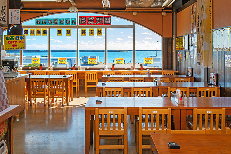 餐廳坐擁壯麗的太平洋景觀,每天14點前,大型渡輪「向日葵號(さんふらわあ)」進港時,食客能在午餐時近距離欣賞這艘宏偉的船隻。伴隨著無邊的海景和新鮮的海產,在此可盡情享受港口城市大洗的獨特魅力。