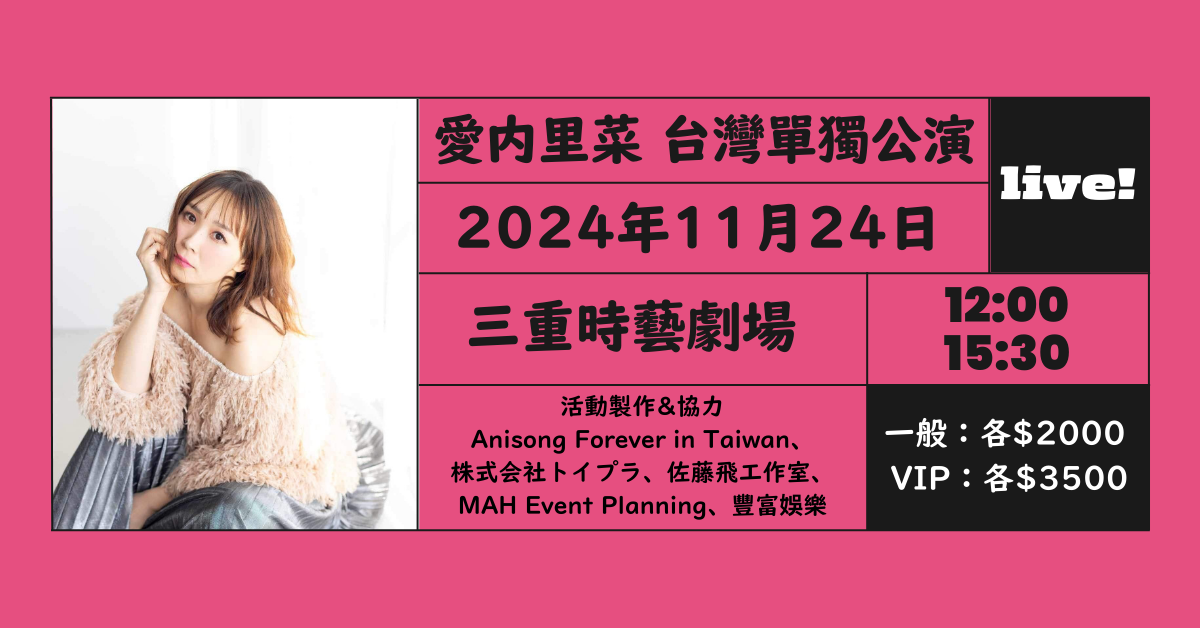 到愛內里菜第一聯想一定是《名偵探柯南》,她曾獻唱多首膾炙人口的主題曲像是:〈恋はスリル、ショック、サスペンス〉、〈I Can’t Stop My Love For You〉,歌聲與作品成為動漫迷的共同記憶,在動漫音樂圈中有著不可忽視的影響力。首次來台的單獨公演內容更是誠意滿滿,一天不僅有兩場演出,單場演出時間更是長達約莫90分鐘,時間分別為:第一場開場12:00、第二場開場15:30,帶領大家沉浸於熟悉的旋律與她獨特的聲音魅力,感受滿滿的回憶與感動!