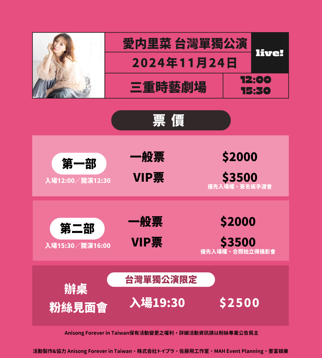 此次除了兩場精心策劃的演出外,還為VIP觀眾準備了特別的特典會活動。第一場VIP特典為簽名板手渡會,不僅可獲得親簽簽名板,還有愛內里菜親自交給粉絲。第二場則是合照拍立得會,讓歌迷能珍藏且近距離互動。除此之外,活動更在當日晚上重磅加碼,一場充滿台式風情的辦桌見面會將於19:30登場(需另行購票,並不包含於演唱會各類票種中)。超獨家的VIP與見面會活動粉絲們千萬不能錯過!詳細活動內容於粉絲專頁公布:https://www.facebook.com/AnisongForever