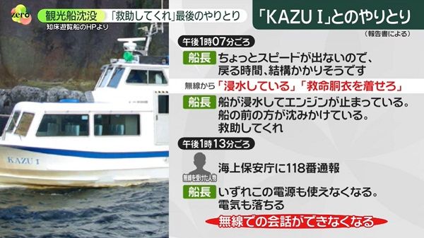 到了中午12點左右,由於海浪開始增大,知床觀光船公司決議取消下午的航班,並在12點55分嘗試用手機連絡船長,但沒有接通。到了1點,本應在3小時準時回到港口的觀光船並沒有回來,注意到這件事的員工連忙透過無線電嘗試聯絡。