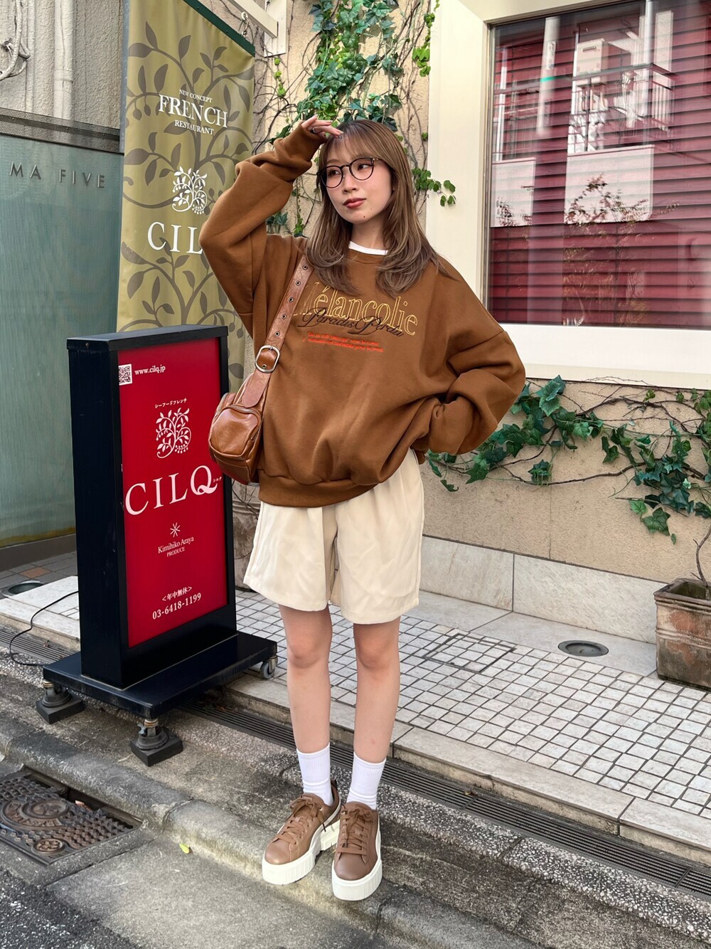 選擇大學 TEE 加上短褲,能使衣著增添幾分學院輕復古風格,利用帶點季節感的咖啡、棕色,為整體注入一股濃濃的秋冬氛圍,內搭一件白色上衣,刻意露出領口,瞬間製造細節的注目層次。