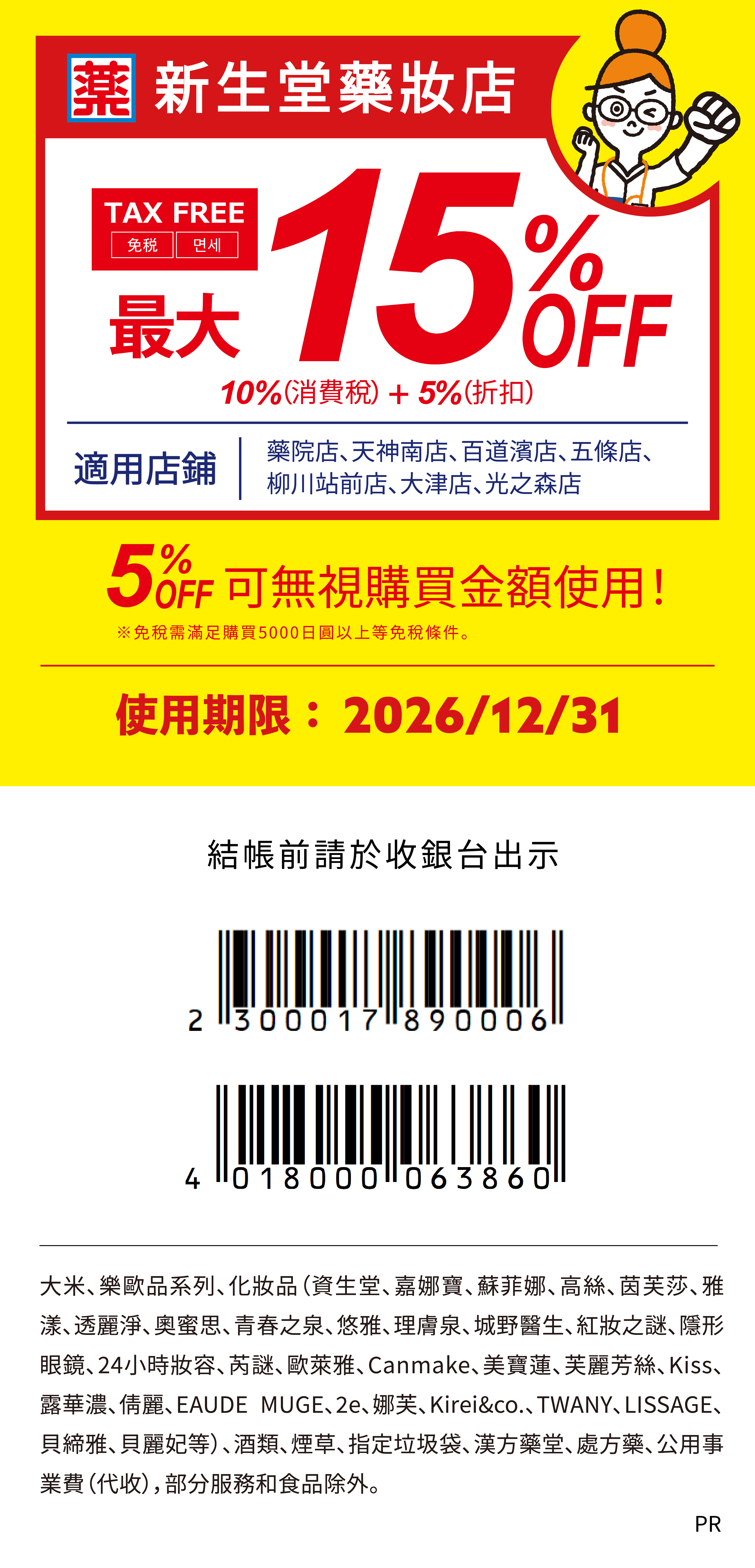 ※ 於櫃台出示優惠券即可享有免稅+5%折扣優惠