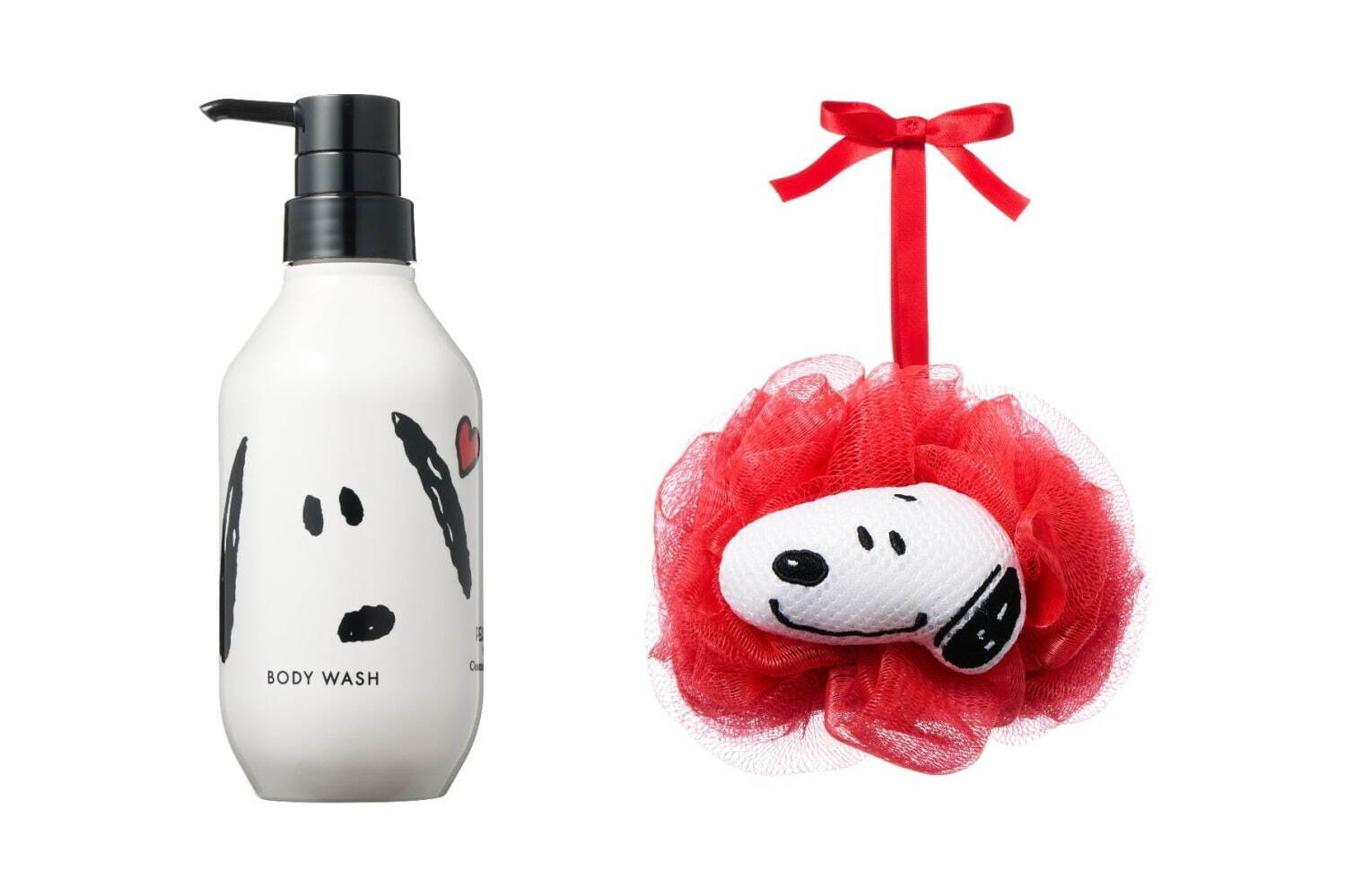 史努比迷必備的身體護理組合!療癒系包裝滿滿史努比元素,沐浴套組內含印有史努比圖案的沐浴乳和史努比臉型海綿。