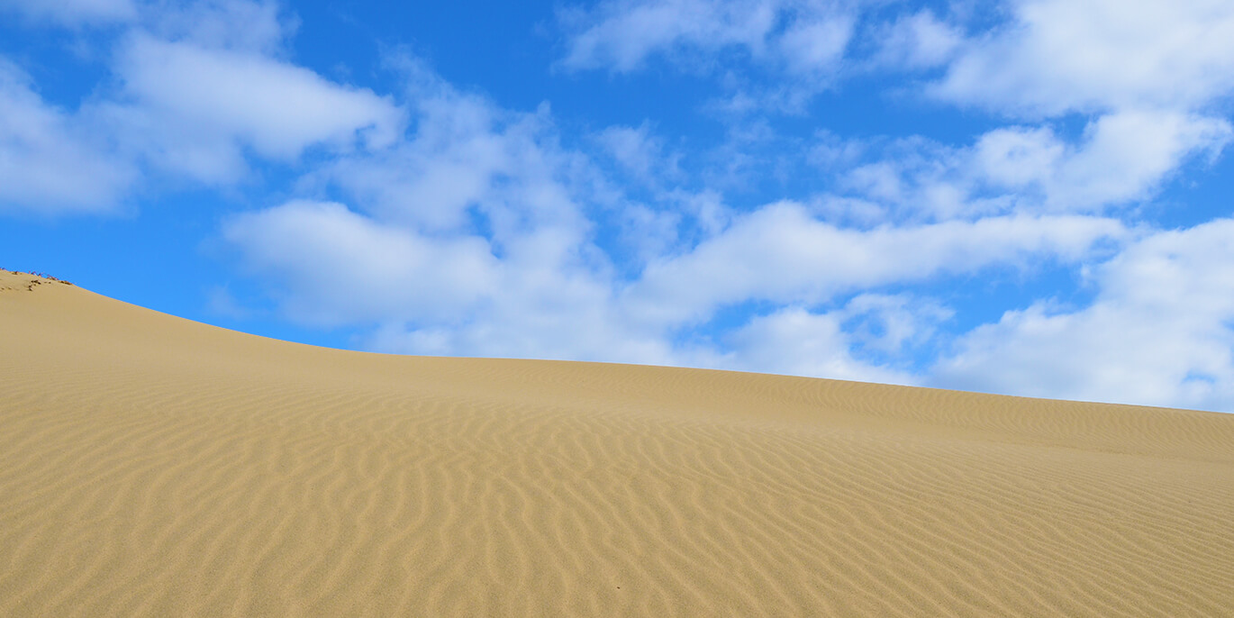 鳥取砂丘是日本最大規模的海岸沙丘,由於整片砂土大地沒有遮蔽物,與蔚藍的天空和壯麗的海洋融為一體,所以被譽為「奇蹟的造形美(奇跡の造形美)」。這片壯麗的沙之大地綿延約16公里,起伏不平,彷彿置身於沙漠般的異國風情,讓人深刻感受到大自然的雄偉力量。廣闊的沙灘隨著天氣和風向的變化,展現出不同的風紋、沙簾和沙柱等紋理,因此每次造訪都能見到不同的沙丘面貌。特別是在冬季,下雪後的鳥取砂丘被一層銀白覆蓋,成為宛如童話般的銀色世界,景致極為夢幻。