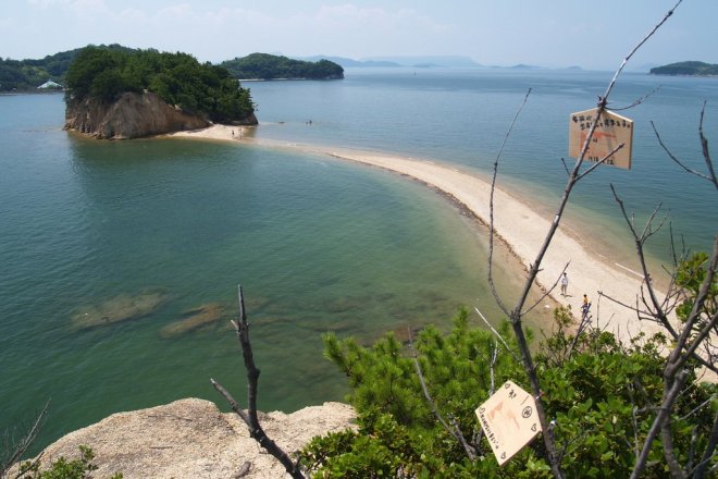 位於瀨戶內海小豆島的「天使之路」是一處浪漫的自然景觀,因其獨特的潮汐現象吸引眾多遊客。每天兩次退潮時,海中會出現一條沙洲小道,將本島與無人島連接起來。傳說中,與摯愛之人手牽手走過這條沙道,在沙洲中央,就會有天使降臨並實現願望。天使之路終點的弁天島上設有「約束之丘展望台」,可敲響幸福之鐘,因此這裡也被視為戀人們的聖地。