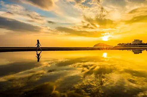 位於香川縣三豐市的海水浴場以其絕美景色成為網紅打卡熱點。這裡擁有約1公里長的沙灘,尤其在日落前後的干潮時分,無風無浪的平靜水面宛如南美玻利維亞的「烏尤尼鹽沼」,能捕捉如映射了天空的鏡面般的夢幻畫面,是攝影愛好者的天堂。