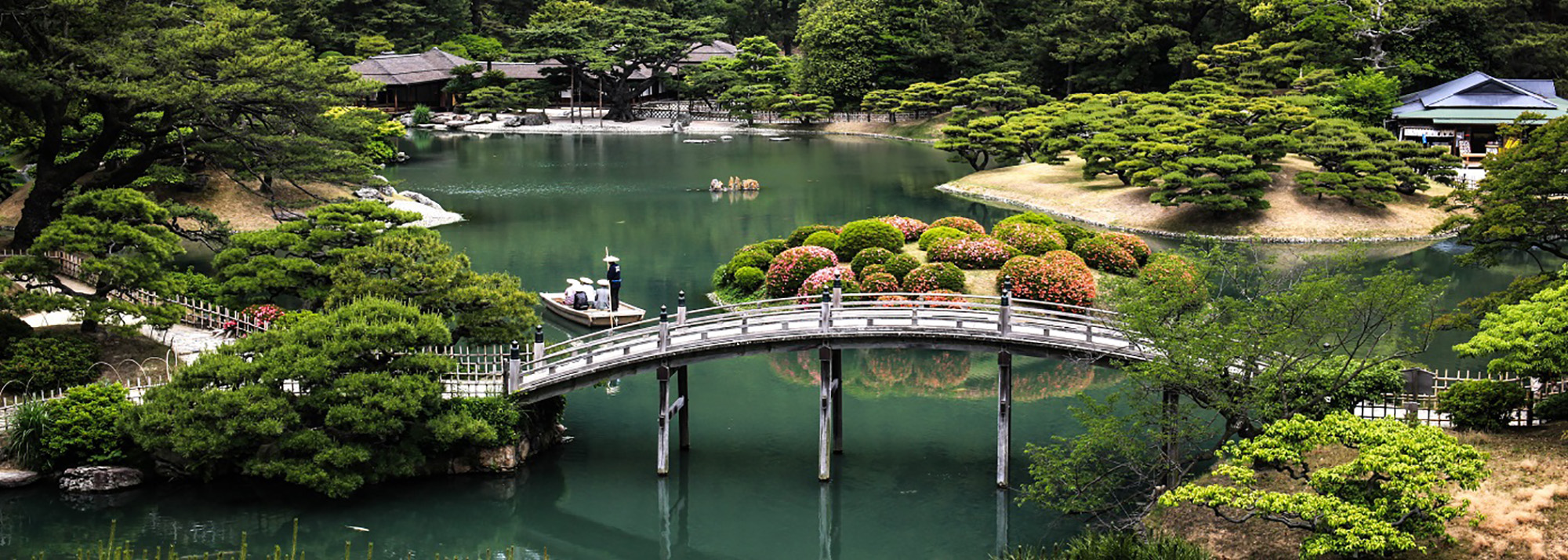 位於香川縣高松市的栗林公園是江戶時期初期建造的一座回遊式大名庭園,被日本指定為國家特別名勝,並在《米其林綠色指南·日本》中獲得了三顆星的高度評價。庭園以紫雲山為背景,共設有六個池塘與十三座築山,分為日本傳統風格的南庭與開放式明治洋風的北庭。園內的「掬月亭」是一座四方皆為正面的珍貴茶室,而從南湖上的偃月橋眺望園景更是令人流連忘返。此外,遊客還可搭乘和船,親身體驗昔日藩主的舟遊樂趣。